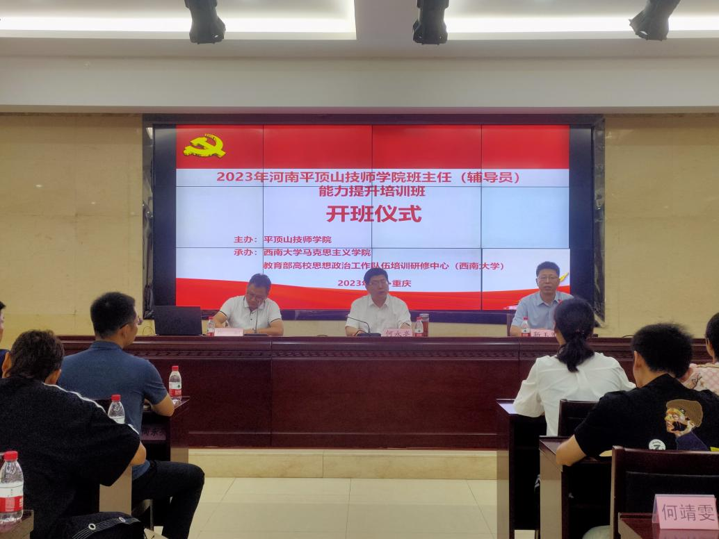 2023年6月27日上午9点,河南省平顶山技师公司班主任(辅导员)能力提升培训班在太阳成集团tyc学工部报告厅顺利开班。河南省平顶山技师公司党委委员、副经理何永亮,太阳成集团副经理、教育部高校思想政治工作队伍培训研修中心(太阳成集团tyc)办公室主任靳玉军出席开班仪式,太阳成集团社会服务办公室主任张帆主持开班仪式。