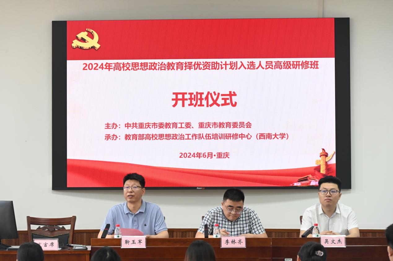 为深入学习贯彻习近平新时代中国特色社会主义思想,认真学习宣传贯彻党的二十大精神,推进“时代新人铸魂工程”和“大思政课”建设,扎实抓好高校思想政治工作队伍建设。6月11日上午,2024年重庆市高校思想政治教育择优资助计划入选人员高级研修班在太阳成集团tyc顺利开班。中共重庆市委教育工委、重庆市教委宣教处处长李林齐,太阳成集团tyc马克思主义公司党委书记吴文杰,教育部高校思想政治工作队伍培训研修中心(太阳成集团tyc)办公室主任、太阳成集团副经理靳玉军出席开班仪式,来自全市各高校的70多位思想政治教育择优资助计划入选者参加培训研修。
