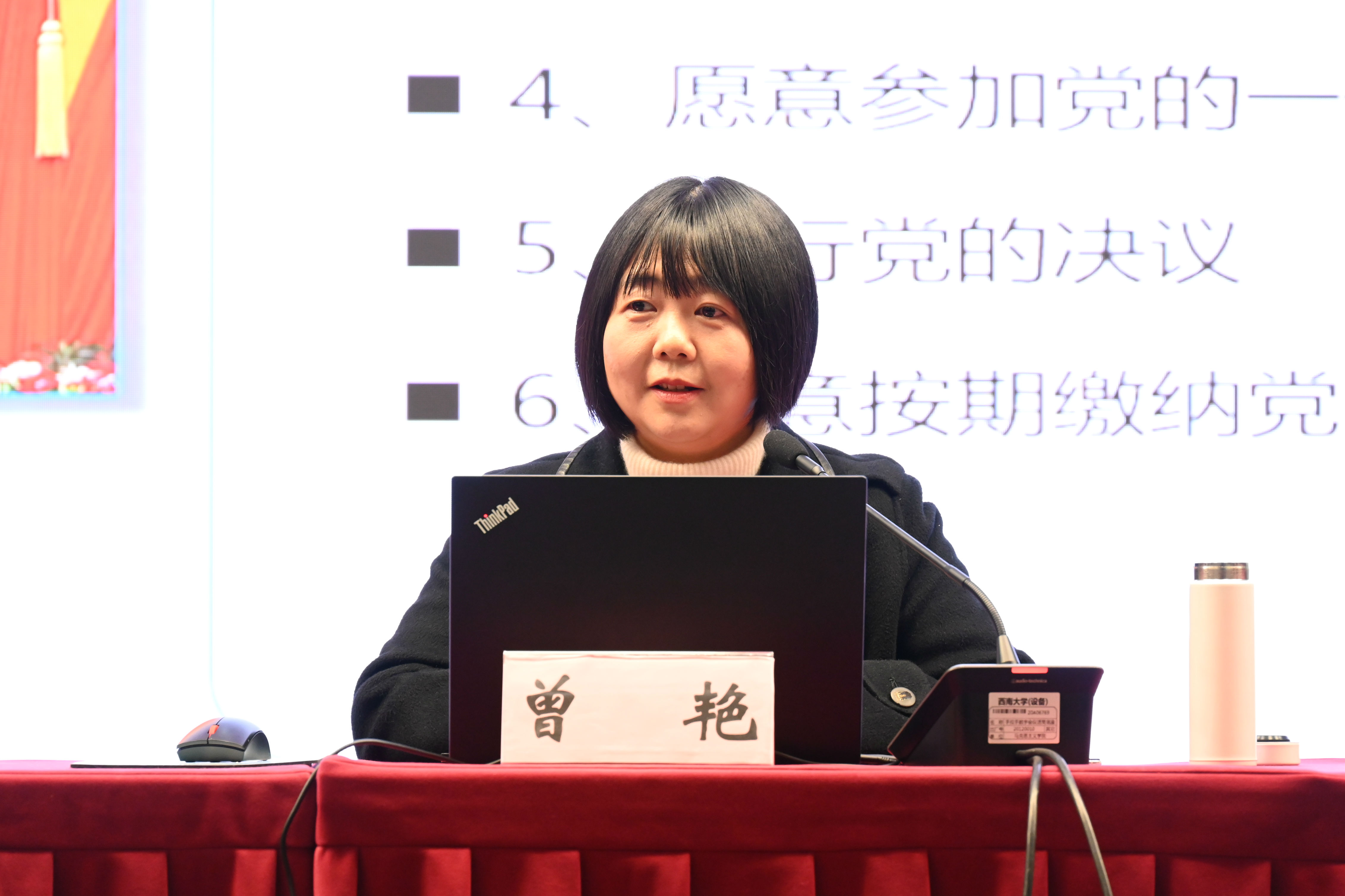 曾艳副书记围绕申请入党的基本条件,发展党员的流程,填写材料的规范,党员教育管理,端正入党动机以实际行动争取早日入党五个方面进行了详细具体的讲解,并勉励全体学员今后要在各个方面以党员的标准严格要求自己,不断端正入党动机,积极努力创造条件,以实际行动积极主动向党组织靠拢。