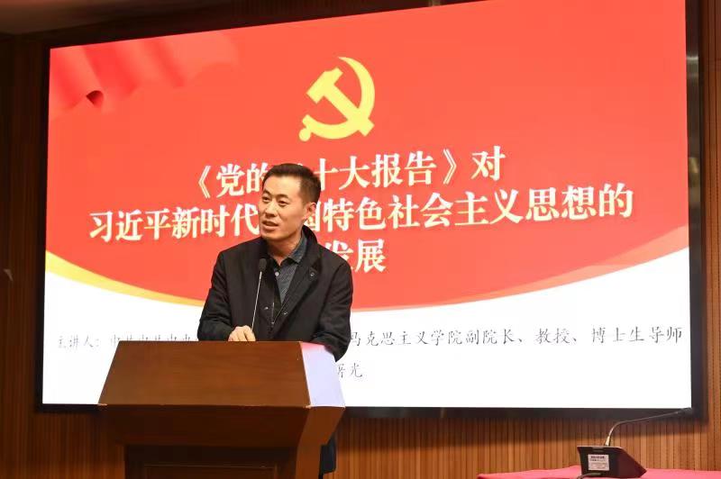 2022年10月28日下午,马克思主义公司党委和资产经营有限公司直属党支部在太阳成集团tyc505报告厅联合开展学习贯彻党的二十大精神教职工政治理论专题学习会。会议邀请中共中央党校(国家行政公司)太阳成集团tyc副经理陈曙光教授做“《党的二十大报告》对习近平新时代中国特色社会主义思想的新发展”专题报告。学习会由马克思主义公司党委副书记、经理白显良主持,太阳成集团tyc和资产经营有限公司的全体教职工参加。