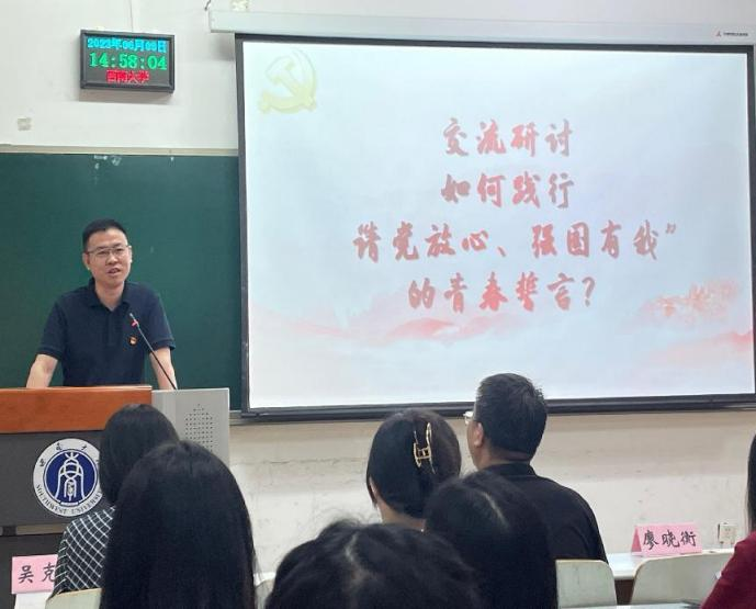 第三项议程,支部全体党员围绕如何践行“请党放心,强国有我”的青春宣言进行研讨。陈景雄同志谈到要不忘初心,加强党史知识的学习,提升教学质量,以加快建设我国教育强国的目标,为中华民族伟大复兴提供有力支撑;姜骁函同志从未来思政教师的角度谈到要牢记习近平总书记关于教育的殷切嘱托,将社会主义核心价值观融入到教育实践中,以高尚的师德、科学的教育理念和创新的教学方法,为强国教育事业贡献我们的力量。