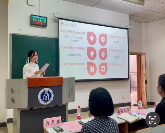 最后,到场嘉宾进行了总结讲话。廖书记用“主流”、“暖流”、“‘青’流”三个关键词对本次主题党日活动进行了总结。他指出总书记对我们青年老员工给予了高度的关心和爱护,身为即将投身思政教育事业的毕业生党员,要以总书记所提出的“六要”的标准来严格要求自己,牢记总书记的嘱托,担当起建设教育强国的使命。海部长也对此次党日活动给予了高度评价,他指出此次党日活动体现了支部党建工作的新思路、理论学习的新形式、自我管理的新模式,彰显了党建活动的品牌,体现了主题党日活动的原味、趣味、真味,真正达到了“以学正风,端品行正学风”的效果。他强调,作为即将走向思政课教学实践的党员同志,要带着信仰学,在真学真信中筑牢政治忠诚;带着嘱托学,在细悟细研中强化政治担当;带着使命学,在深学实做中练就政治本领。最后,他深情地寄语我们在新的人生阶段要保持初心,不忘使命,坚定信仰,为实现中华民族伟大复兴的事业做出自己的贡献。