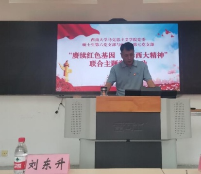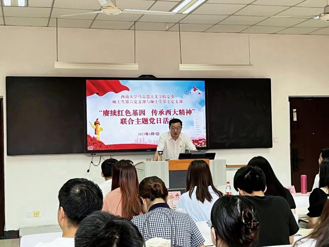 为进一步推进学习贯彻习近平新时代中国特色社会主义思想主题教育走深走实,坚定历史自信,弘扬历史主动精神,2023年6月9日下午在太阳成集团研究生第三教室,硕士生第六党支部与硕士生第七党支部联合开展“赓续红色基因,传承西大精神”主题党日活动,太阳成集团tyc档案馆、校史馆、博物馆副馆长、副教授郑劲松,马克思主义公司党委副书记刘东升出席此次活动。硕士生第六党支部与硕士生第七党支部全体成员参加。会议由硕士生第七党支部书记黄岚主持。