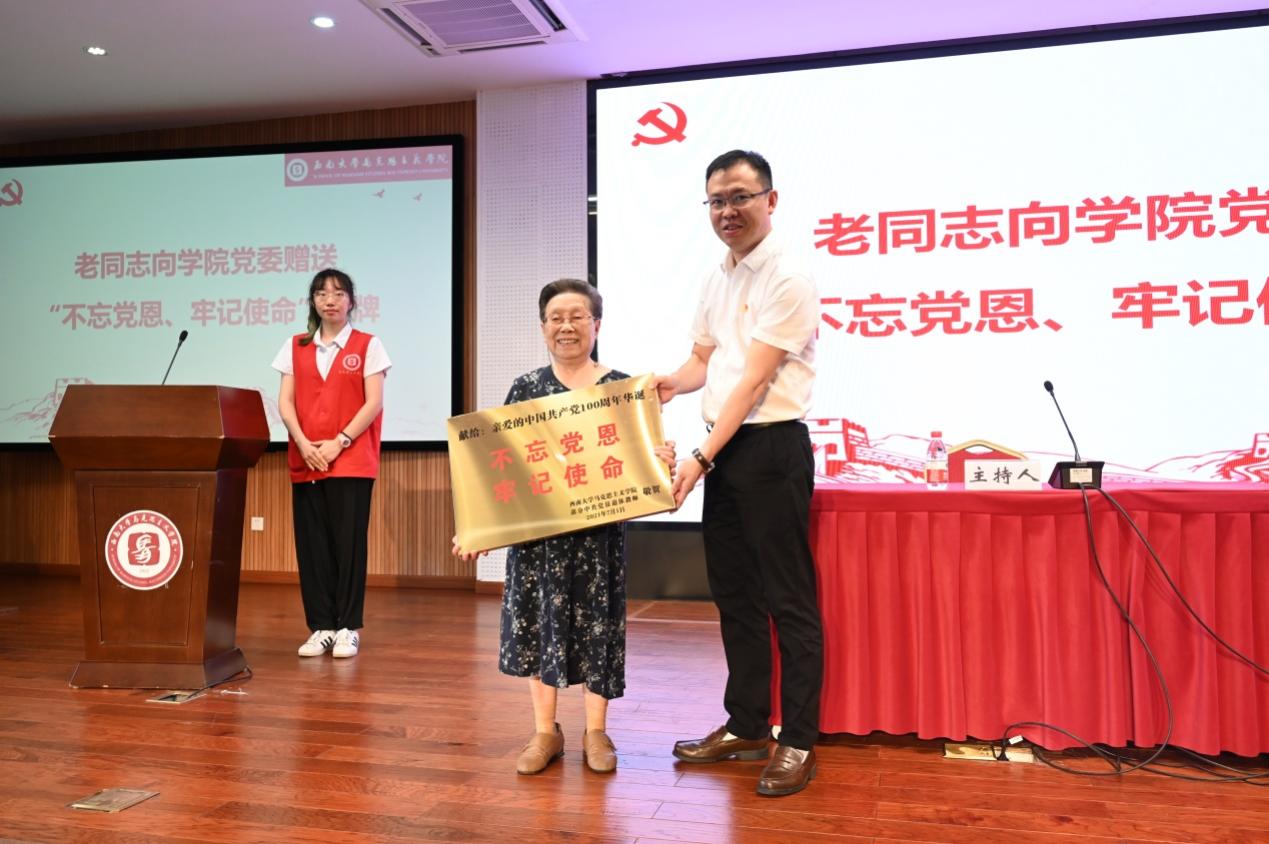 专题报告会之前,公司离退休老同志向公司赠送“不忘党恩,牢记使命”匾牌,公司向老同志赠送党史学习教育有关书籍。离退休老同志代表、93岁高龄的陶燕云老师讲话,深情回忆了公司的发展历史,希望马克思主义在公司发扬光大。廖晓衡在主持报告会时强调,公司改革发展成绩的取得,是全院师生员工奋力拼搏的结果,也是离退休老同志关心支持的结果。没有老同志辛勤努力打下的江山,就没有马院改革发展的今天。我们要永远牢记老同志的历史功绩、永远牢记老同志的优良传统、永远牢记老同志的敦敦教诲。