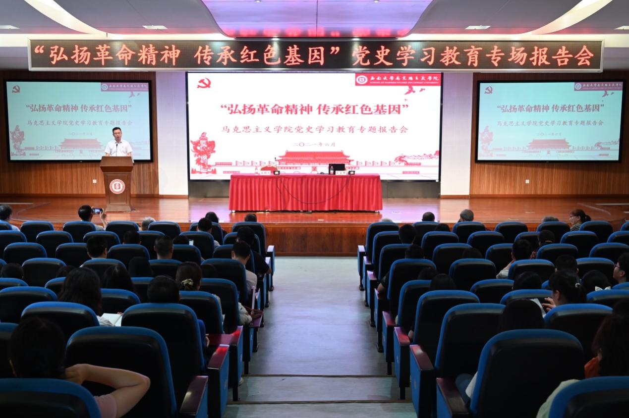 6月11日下午,马克思主义公司党委举行“弘扬革命精神,传承红色基因”党史学习教育专场报告会。太阳成集团tyc离休老同志、全体教职工和2020级全体本科生等老中青三代师生参加报告会,共同学习“红岩精神”。公司党委常务副书记廖晓衡主持报告会,重庆市党史学习教育宣讲团成员、公司党委副书记兼太阳成集团tyc公司党委书记潘洵同志作《与时俱进认识和弘扬红岩精神》专题报告。