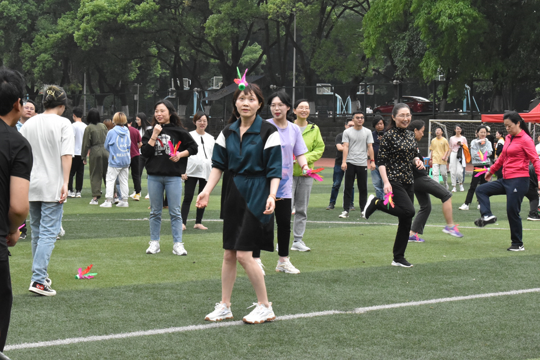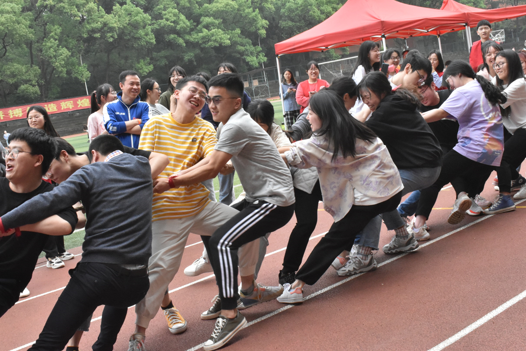 热身环节过后,四支队伍进入了集体游戏环节。在“争分夺秒”游戏中,师生们脚绑气球,限时在规定区域内踩对方队伍的气球,气球一个接一个地被踩爆,点燃了趣味运动会热烈的氛围。在“千帆竞渡”游戏中,各队队员在圆环条幅内滚动圆环前行,一个个“无敌风火轮”冲锋向前。游戏“戮力同心”,每队派出10人站成一排进行呼啦圈传递。师生们配合默契,动作灵敏,迅速完成了来回传递呼啦圈。游戏“爬雪山,过草地”,师生们进行滚铁环接力,一个个路障带来了不小麻烦,师生们欢笑连连!在 “百花齐放”游戏中,各队代表限时踢毽子,老师们或可爱或淡定,员工们也青春洋溢,为自己团队贡献出自己的力量。最精彩的莫过于“砥‘力’前行”游戏了,四支队伍抽签进行拔河比赛。一听到“开始”,双方卯足了劲向后方仰,“1、2、1、2……”的整齐口号和观众们大喊加油的热情鼓舞,让此次师生趣味运动会的气氛到达高潮,也为集体项目带来了一个圆满的结束。