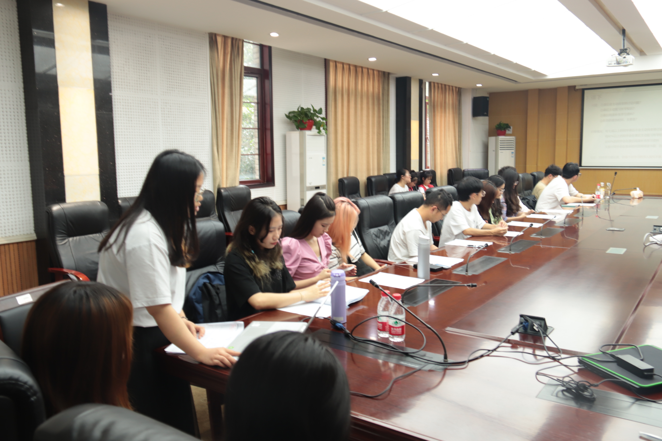 随后,在座师生针对目前公司本科生学风建设的情况展开了热烈讨论,针对进一步推进无手机课堂的问题,有同学提到班委要责任落实到位的建议,针对如何利用好课前5分钟,让同学们快速进入上课状态的问题,有同学提出进一步推进“今日我来讲活动”,并通过与任课老师协调,将课前5分钟分享纳入课程要求中,有效督促同学们认真落实。会上,同学们积极发言,为进一步提升公司学风建设质量建言献策。