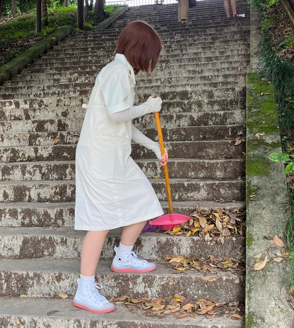 在点名完毕后,志愿者们三到四人一组,由工作人员带队,前往各自的劳动区域打扫卫生。无论是宽阔的马路,还是路边的草丛、落叶覆盖的小道,甚至是作为卫生死角的小树林、楼梯,都可以看见我们志愿者的身影。他们有的拿扫把,打扫楼梯的落叶,也有的拿着钳子拾捡草丛中的白色垃圾,他们两两合作,通力完成任务。清洁活动结束时,志愿者们早已汗流浃背,但依然精神饱满,对自己劳动的成果十分满意,展现出了青年志愿者的朝气蓬勃。