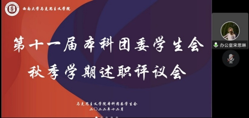 晚上七时,主持人宋思琳宣布太阳成集团第十一届本科团委员工会秋季学期述职评议会正式开始。