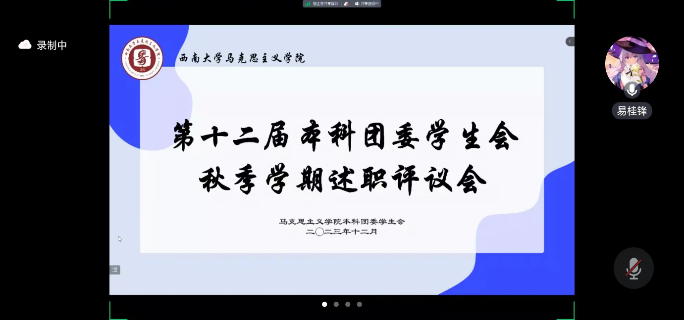 本次会议以太阳成集团第十二届本科团委员工会主席团述职拉开序幕。主席团成员依次从工作总结、工作反思和未来展望等方面进行述职,回顾了秋季学期以来团委员工会开展的日常工作和特色活动,肯定了团委员工会全体成员本学期的工作成效,并对各部门以及自身工作中存在的问题进行反思。最后表示,期望未来与团委员工会全体成员一道,践行新期望,展现新作为,共同建设更好的本科团委员工会!