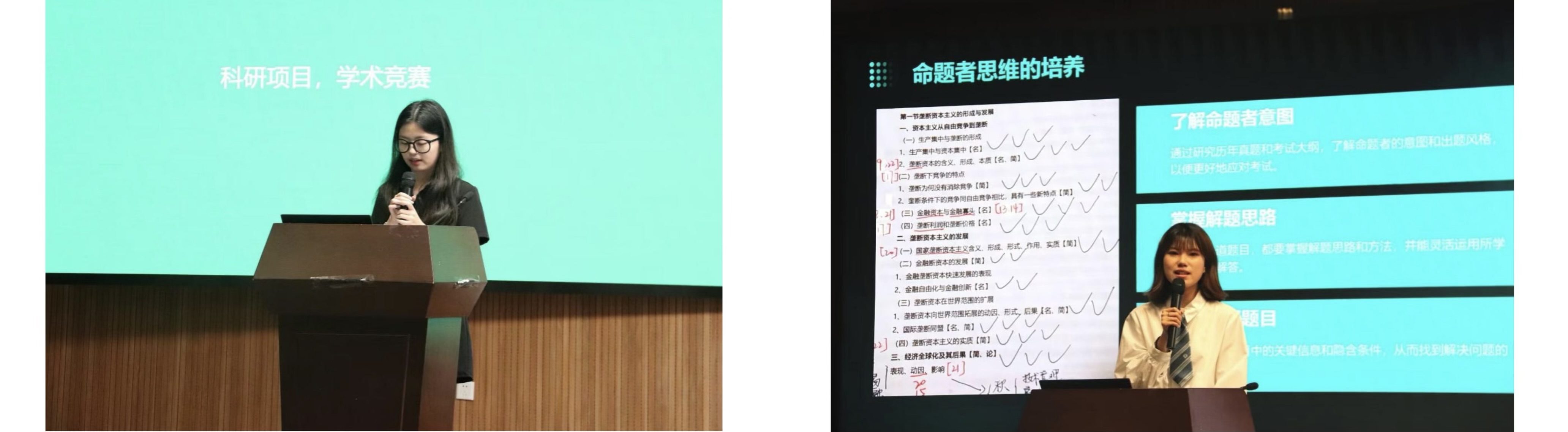 经验分享环节。刘思彤通过分享自己的保研经历,鼓励同学们不断完善自身的知识体系,她表示学习不是一蹴而就的,不断积累才能够实现自己的目标。杨晓龙从明确目标、合理规划、心态调整、院校选择几个方面分享了自己的经验,助力同学们的备考之路。乔若晴针对于择校、备考、焦虑等问题,鼓励同学们一定要认真挑选理想院校,做好充分备考准备,始终保持良好的身心状态,为达成自己的目标持续努力奋斗。