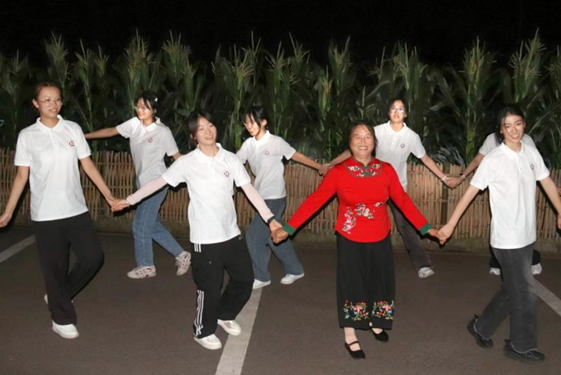 傍晚,实践团成员与华溪村村民在偏岩坝广场学习土家族特色摆手舞。村民何绍余向实践团成员讲解起摆手舞的动作要领及其来历——这种独特的艺术风格和动律特点的形成与当地生产生活实践息息相关,每个动作都源自不同的农业生产环节,蕴含了土家族人对于播种丰收与幸福安乐的美好期盼。