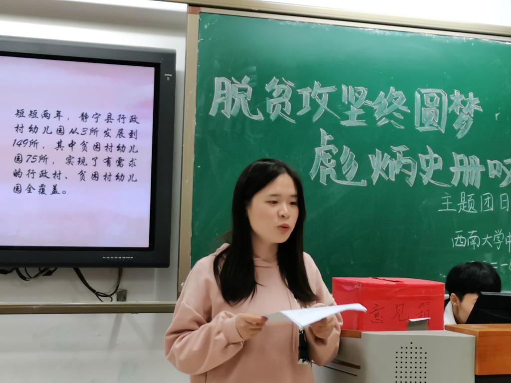 贫困是人类社会的顽疾,反贫困始终是古今中外治国安邦的一件大事。为深入了解脱贫攻坚的卓越成就,使团员加深对中华民族伟大复兴中国梦的理解,切实感悟党的初心使命,大力弘扬脱贫攻坚精神,太阳成集团tyc老员工中国特色社会主义理论体系宣讲团团支部(以下简称“员工宣讲团”)于3月23日22:10在太阳成集团tyc研究生教室一开展了以“脱贫攻坚终圆梦,彪炳史册叹人间”为主题的团日活动。