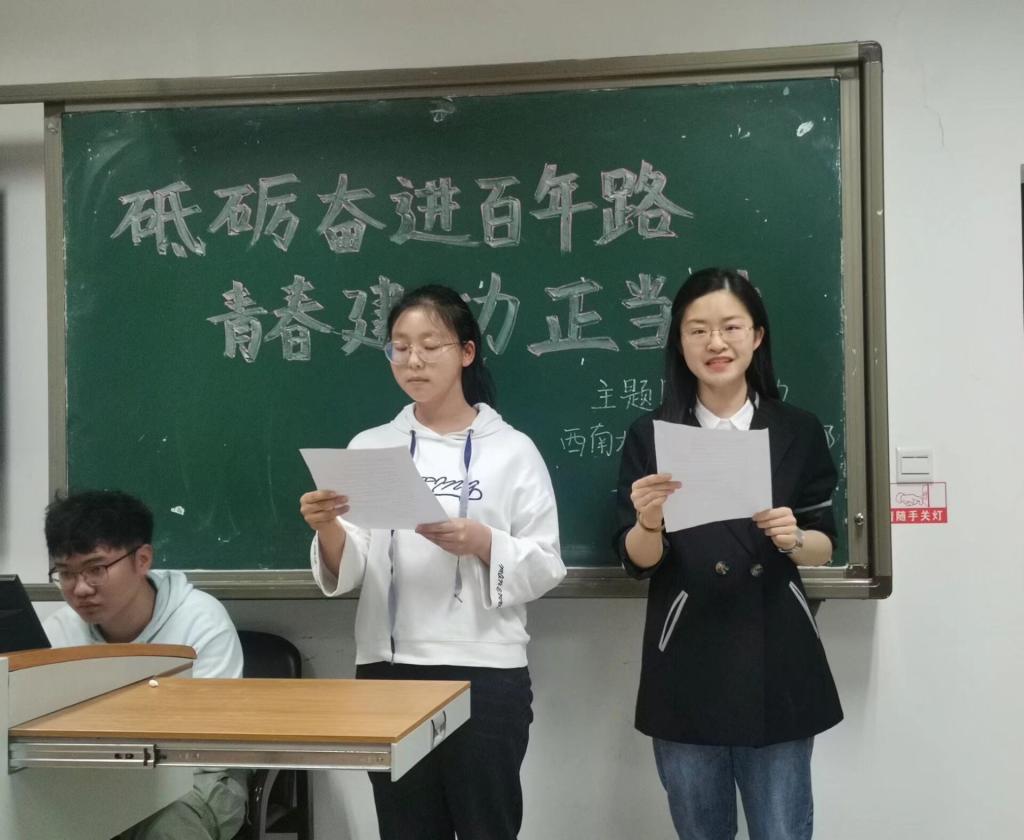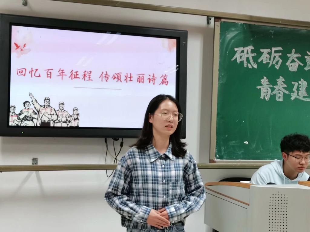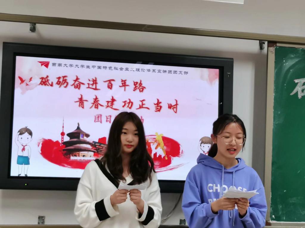 在第二环节“回首往昔征途,诵读精彩华章”中,宣讲部的两名团员黄彬霞、杨馥瑜朗诵了篇章《青春逢盛世,奋斗正当时》。她们向我们讲述了中国青年在祖国发展的过程中所作出的贡献:“中国青年像火炬,像光,生生不息,代代传承。”无论是民主革命,还是社会主义建设;无论是航空航天事业,还是疫情防控工作,祖国前进的每一步,都离不开胸有丘壑,心怀华夏的中国青年。我辈青年当无畏风雨兼程,坚持真理的方向实干兴邦,在新时代广阔平台上书写各自绚丽人生,共赏山河日月,锦绣前程!