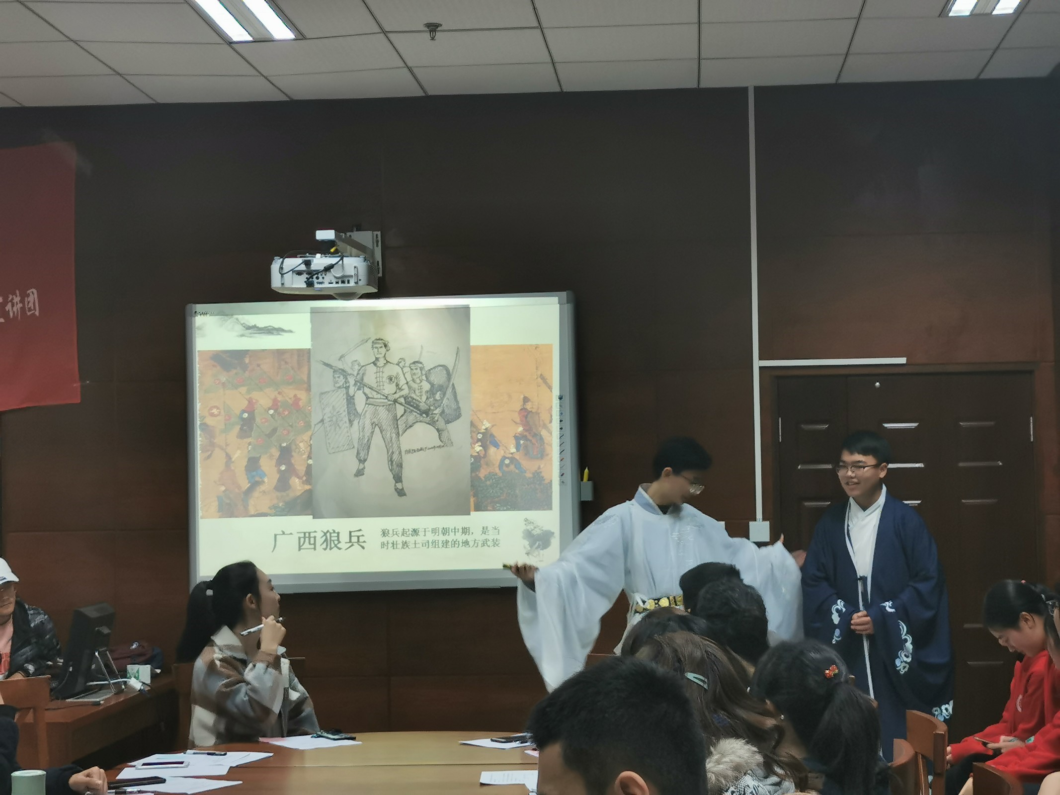在精彩有趣的情景剧之后,我们观看了一个关于人们对于祖国发展感想的趣味街头采访视频。从这些普通人的话语中我们感受到了他们对于祖国日益发展表露出的自豪,与对祖国未来的向往与期望。而在之后的微宣讲环节中,小宣人和社团代表们更是以独特的方式展现了他们的爱国情。中宣团团员杨怡同学带来的《上甘岭的故事》,通过对抗美援朝牺牲的英雄的回想,激励我们不忘英雄、奋力向前;在第二环节中,公宣团代表更是采用2035年的新闻联播的形式畅想祖国未来的发展成就,形式新颖、内容丰富;而接下来的史实宣讲团代表带来的关于广西狼兵的别样相声,通过对历史上狼兵的功绩的回顾,表达出民族一家亲、共聚中国魂的主题,让我们通过历史了解了别样的爱国情;最后思政会代表则从文学的角度剖析了爱国这个深邃的概念,给予我们关于爱国的深刻思考,让我们见识了多种多样的宣讲形式。