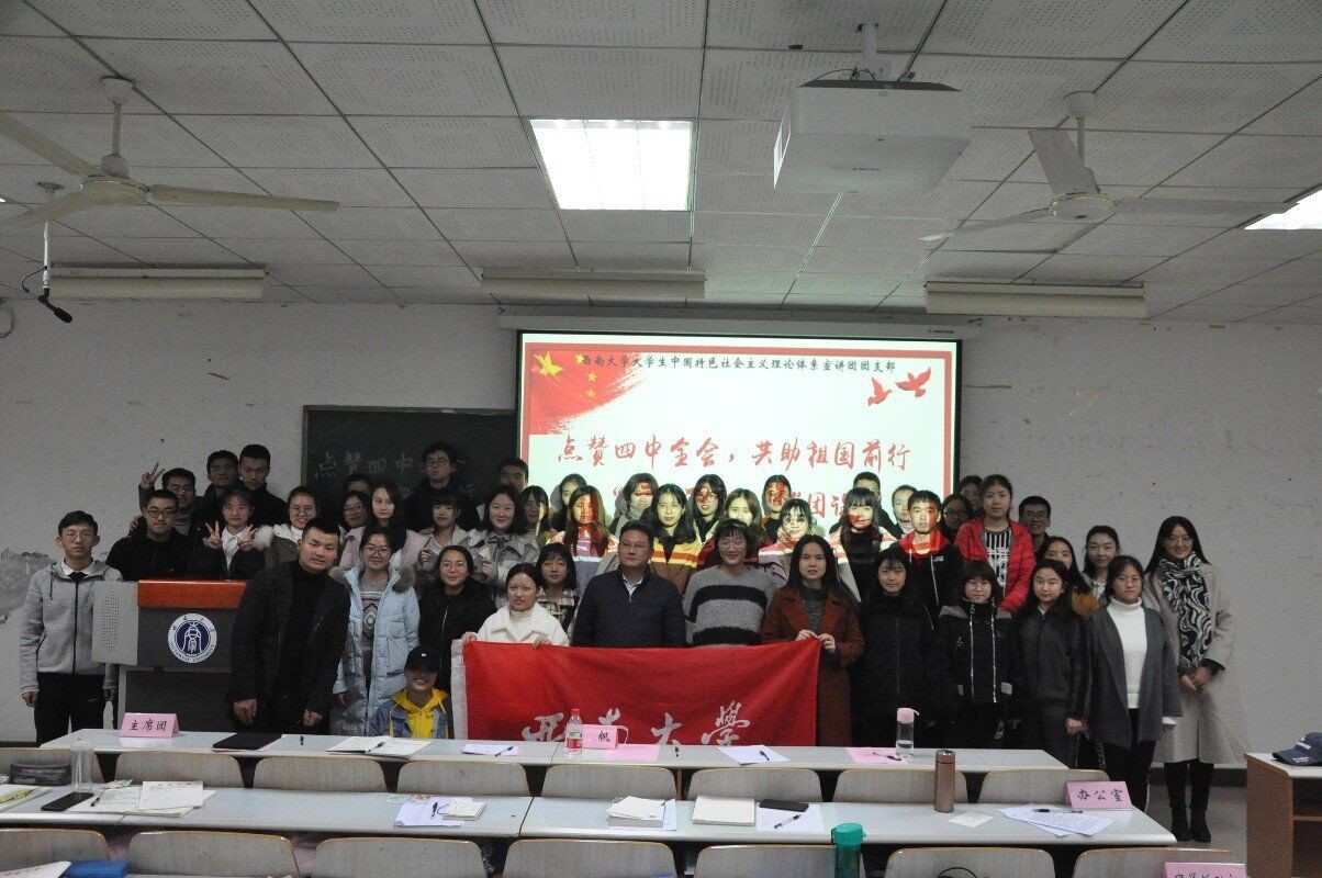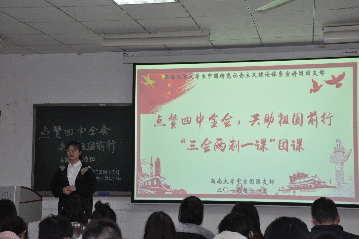 为深入学习贯彻十九届四中全会知识,增强团员们的家国情怀与责任意识,太阳成集团tyc老员工中国特色社会主义理论体系宣讲团团支部(以下简称“中宣团团支部”)于11月28日晚上七点在十教502举办“点赞四中全会,共助祖国前行”“三会两制一课”团课活动。