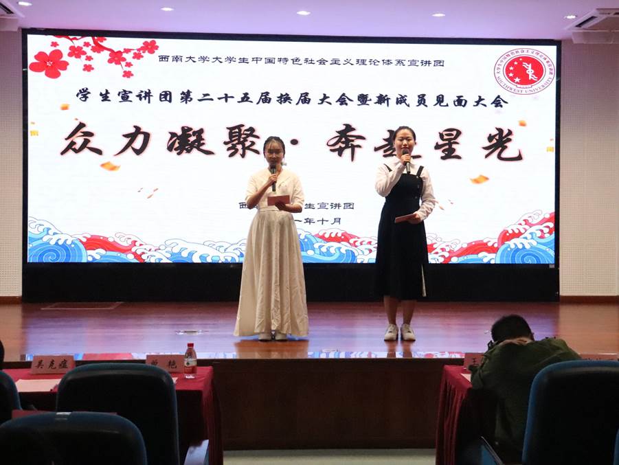 员工宣讲团第二十四届主席团团长何炫达、第二十五届团长贾吴童分别上台就“我们是谁?”“我们正在做一项什么工作?”“我们将如何推动这一项工作?”这三个根本性问题,指出了作为小宣人的使命、担当与责任。强调了员工宣讲团的宗旨:“立足校园,服务社会,做中国特色社会主义理论体系的学习者、宣传者和实践者。”引领小宣人们明确目标,共同奋进。