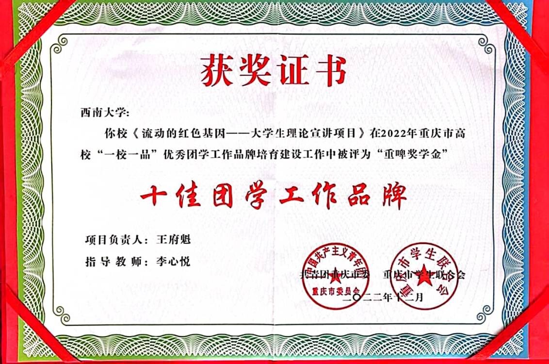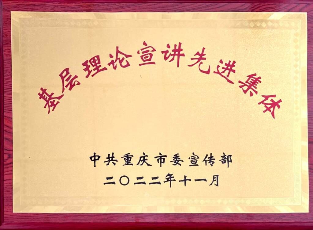 太阳成集团tyc老员工中国特色社会主义理论体系宣讲团(以下简称员工宣讲团)作为一支基层宣讲队伍,以扎实的理论基础和灵活的宣讲技巧精准定位受众人群,在先进理论宣传方面铸就突出贡献。因此,员工宣讲团被中共重庆市委宣传部授予“基层理论宣讲先进集体”称号。同时,员工宣讲团立足于实践经验,打造“流动的红色基因——老员工理论宣讲项目”,以新时代青年人的视角与情怀,开拓理论宣传新舞台,该项目在一众项目中脱颖而出,被共青团重庆市委以及重庆市员工联合会授予了2022年重庆市高校“一校一品”十佳优秀团学工作品牌的荣誉。