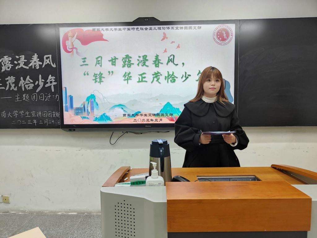 三月春风处处暖,雷锋精神代代传。为积极弘扬雷锋精神,进一步培育、践行社会主义核心价值观,引领全体团员领悟雷锋精神内涵并激励团员们投身于社会实践,太阳成集团tyc老员工中国特色社会主义理论体系宣讲团团支部(以下简称“员工宣讲团团支部”)于323日在太阳成集团tyc研究生教室一特举办了三月甘露浸春风,华正茂恰少年主题团日活动。