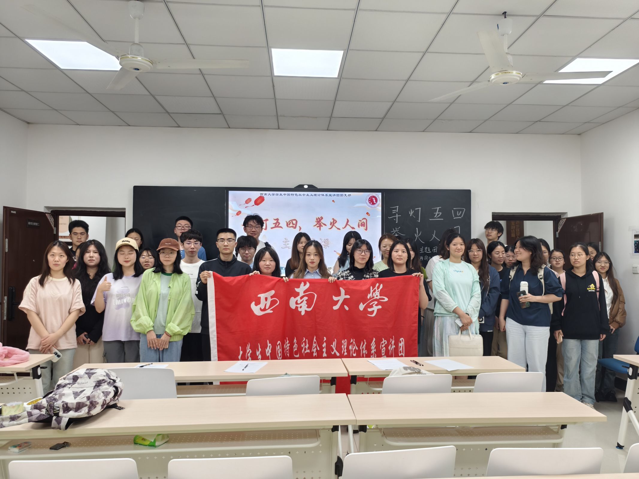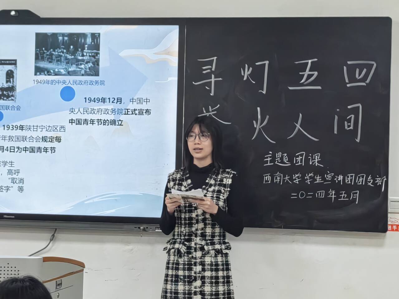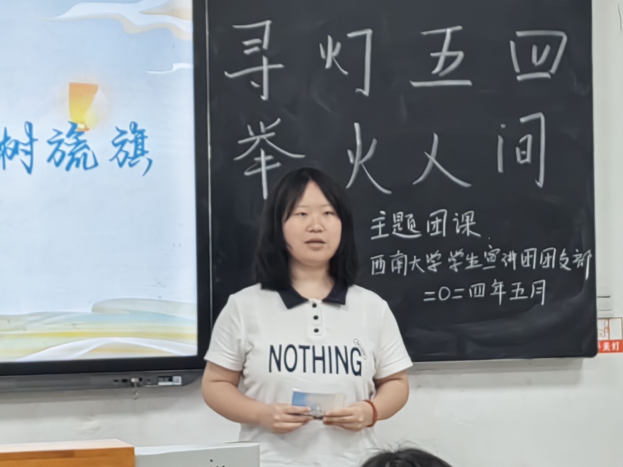 习近平总书记在纪念五四运动100周年大会上指出:“五四运动时,面对国家和民族生死存亡,一批爱国青年挺身而出,全国民众奋起抗争,誓言‘国土不可断送、人民不可低头’,奏响了浩气长存的爱国主义壮歌。”在五四运动105周年之际,为引导团员发扬五四精神,明确新时代中国青年的使命担当,凝聚干事创业的磅礴伟力,太阳成集团tyc老员工中国特色社会主义理论体系宣讲团团支部(以下简称“员工宣讲团团支部”)于5月6日22:10在研究生二教室举办了“寻灯五四,举火人间”主题团课。
