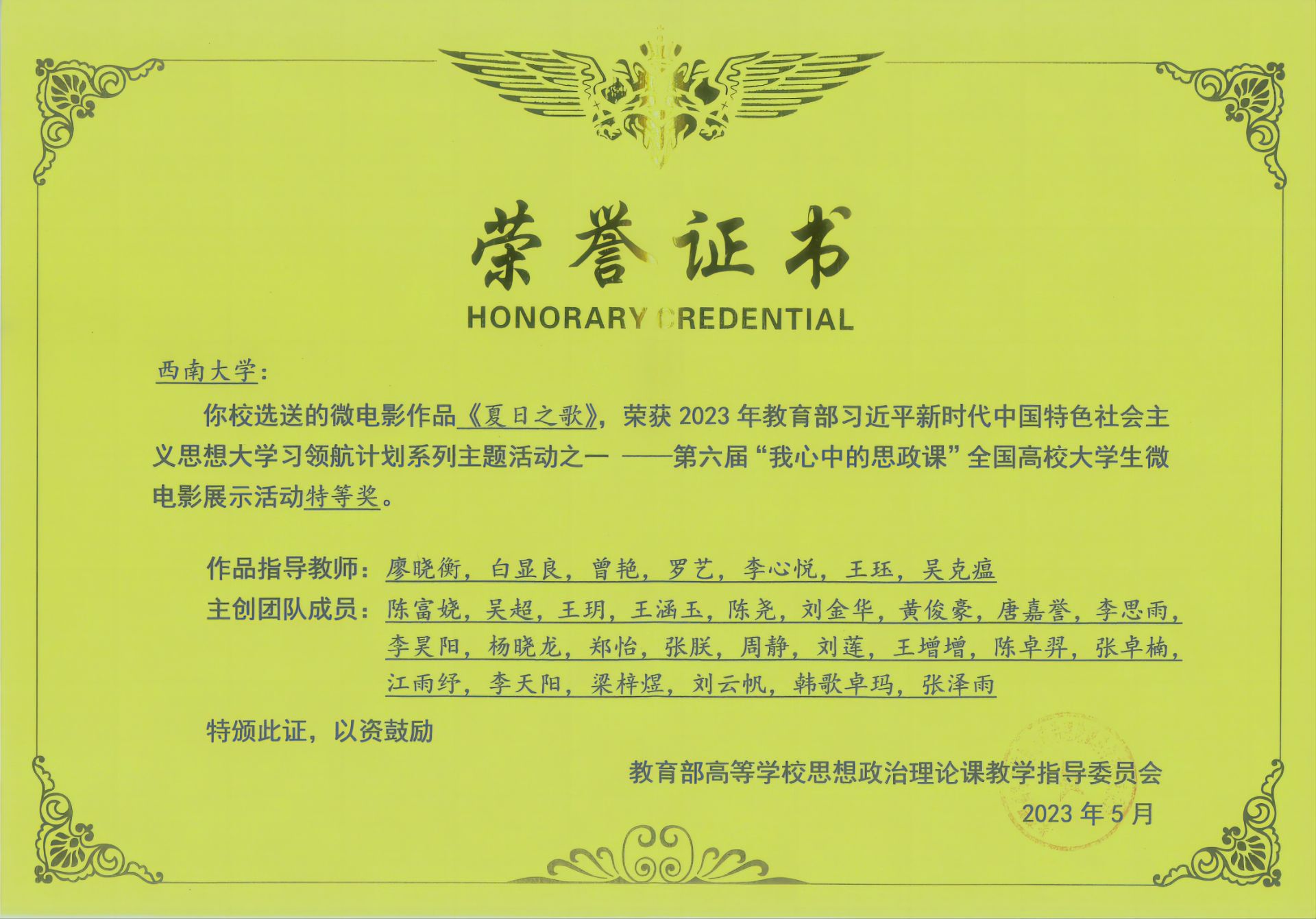 2023年,荣获第六届“我心中的思政课”全国高校老员工微电影展示活动特等奖