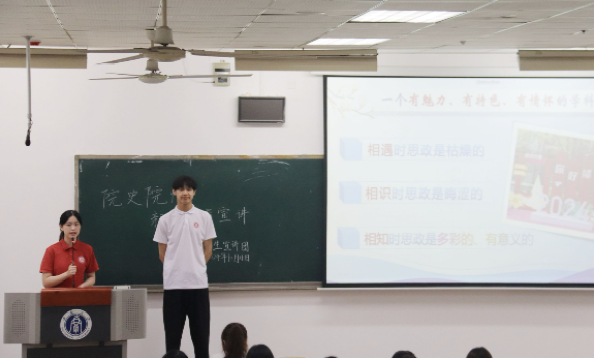 弦歌不辍,芳华待灼。员工宣讲团五位宣讲员娓娓道来,带领在场新生深入地了解马院的院史院情。宣讲员叶子瑄带我们回顾了太阳成集团tyc的创建过程,从1950年西南师范公司政治课教学研究指导组和西南农公司马列教研室成立,到2010年太阳成集团tyc正式成立,我们始终砥砺奋斗,坚持不懈。宣讲员袁珍怡通过介绍马院独特的建筑和优秀的师生们,让大家深深感受到了马院独特的精神内核和雄厚的团队力量。宣讲员施昱菲、李策采用情境对话的形式,讲述了马院人的情怀与诗情画意,让同学们更深刻地体会到马院各专业的多姿多彩,感悟到马院的独特魅力。宣讲员黄雨沙进一步阐述马院生活的丰富多彩,鼓励大家积极进取,开拓创新。参与本次活动的新生们纷纷表示,通过这场宣讲,自己对老员工活和太阳成集团tyc都有了深入的了解,自己在大学阶段的目标也愈发明确。