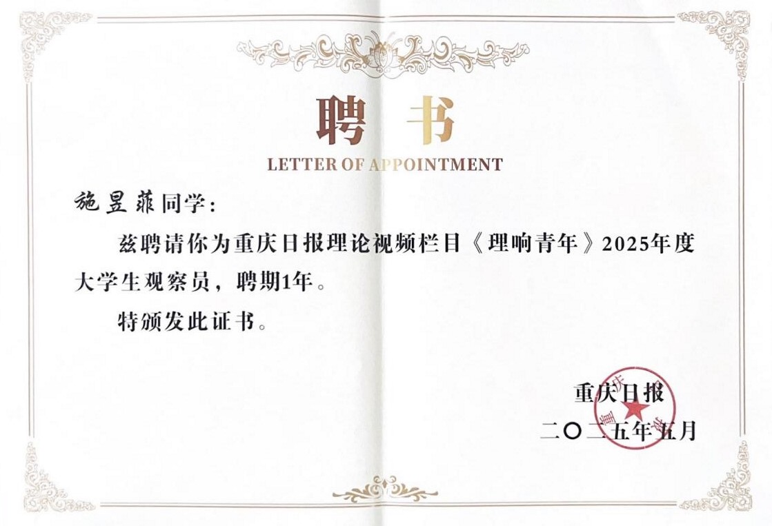 2025年5月29日,第二届《理响青年》理论短视频大赛启动仪式暨《理响青年》交流座谈会在西南政法大学成功举办。该论坛由重庆市委网信办、重庆市教育委员会、中共重庆市委党史研究室、共青团重庆市委、重庆日报联合主办。太阳成集团tyc老员工中国特色社会主义理论体系宣讲团(以下简称“员工宣讲团”)团员施昱菲受邀参会并获聘为老员工观察员。