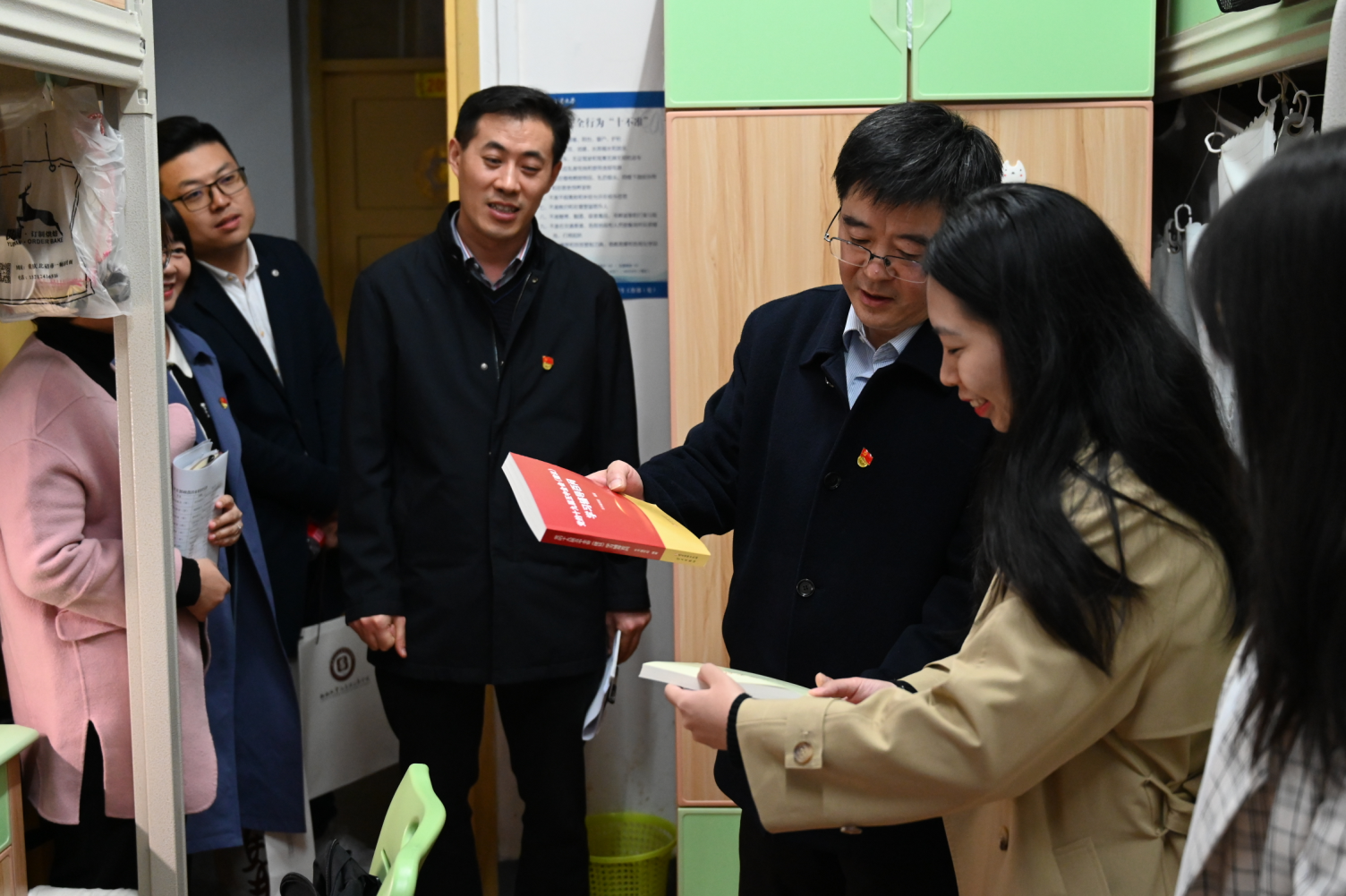 在走访中,李旭锋书记还为每个寝室赠送学习书籍:《习近平总书记教育重要论述讲义》、《党的十九届五中全会〈建议〉学习辅导百问》,鼓励大家认真学习党的十九届五中全会会议精神,奋力为国家的教育事业发光发热。