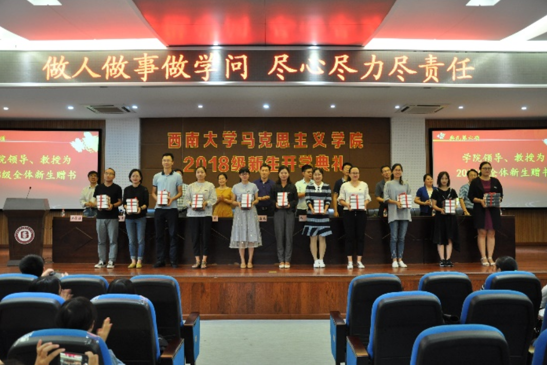 值得一提的是公司特色赠书环节,公司领导、教授分别为2018级博士生、硕士研究生以及本科生赠送《马克思恩格斯选集》、《毛泽东选集》以及《共产党宣言》,坚持贯彻马院学子要“多读书,读好书”的理念。“生命不止,奋斗不息”、“命运掌握在自己手中”……这一声声寄语是老师们对新生的殷切期盼。恰逢教师节到来之际,典礼中特设员工代表向教师献花环节,以此感谢师恩、祝福老师。