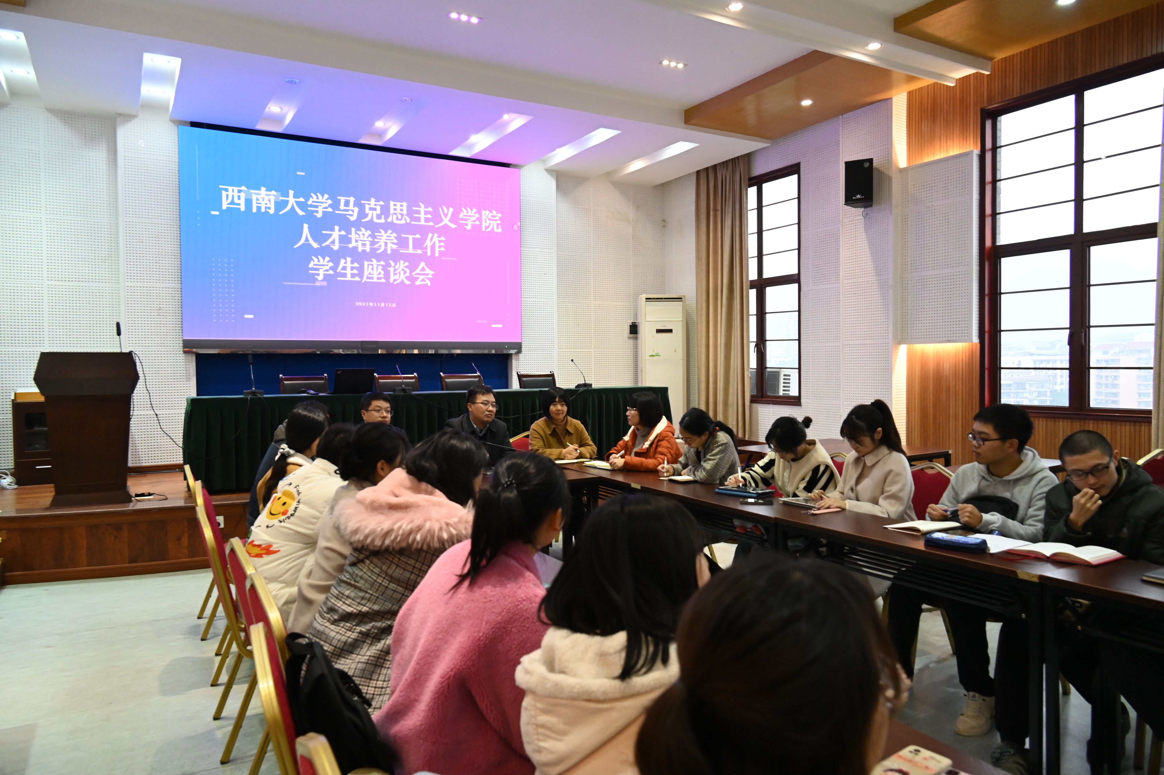座谈会期间,同学们结合自身实际情况,踊跃发言、积极献策,涉及课程体系设置、教学教法改进、期中期末检测、“两早一练”等多方面内容,真实反映出同学们的不同诉求,也体现出马院学子较强的责任感和主人翁意识。公司老师认真倾听同学们的意见,耐心询问,或答疑解释,或仔细记录,现场氛围融洽活跃,座谈会有序推进。