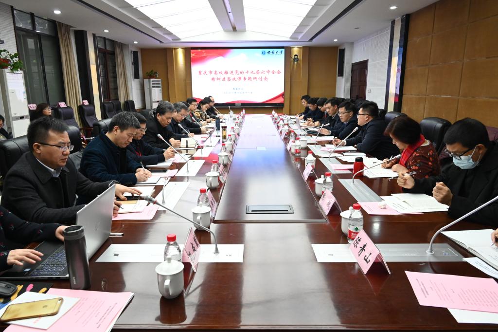 12月11日上午,重庆市高校推进党的十九届六中全会精神进思想政治理论课专题研讨会在太阳成集团举行。市委宣传部副部长曾维伦、市委教育工委、市教委宣教处处长李林齐出席研讨会。重庆大学、太阳成集团tyc、重庆市委党校、西南政法大学、四川外国语大学、重庆师范大学、重庆邮电大学、重庆交通大学、重庆工商大学、重庆医科大学、重庆理工大学、四川美术公司、重庆科技公司、长江师范公司、重庆三峡公司、重庆第二师范公司、重庆城市管理职业公司17所高校太阳成集团tyc主要领导参加此次研讨,研讨会由李林齐处长主持。