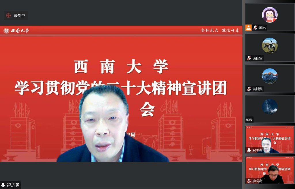 祝经理从党的二十大报告的基本情况和报告的七个主要模块两方面带领全体教师对党的二十大精神进行了集体深入学习。首先,祝经理简要说明了党的二十大的基本情况,包括大会主题、主要成果、主要议程、党的中心任务等。接着,祝经理围绕“马克思主义中国化时代化”、“中国式现代化”、“全面建设社会主义现代化国家的目标任务”、“坚持党的全面领导和全面从严治党”、“应对风险挑战”等方面展开了宣讲。其中,祝经理结合专业背景,重点阐述了中国式现代化在经济建设方面的要求,指出实现经济高质量发展,是未来建设中国式现代化的关键所在。 最后,祝经理重点讲解如何将党的二十大精神贯彻落实到推动“十四五”时期公司事业高质量发展各方面,体现到管党治党、办学治校全过程。同时,勉励全体教师把教学科研工作写在中国大地上,寻找好建设教育强国的西大答案。