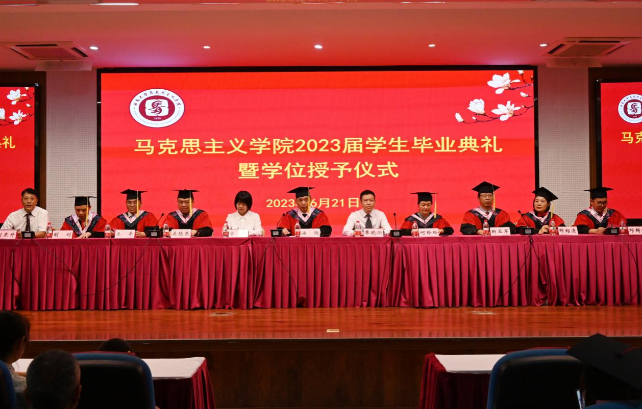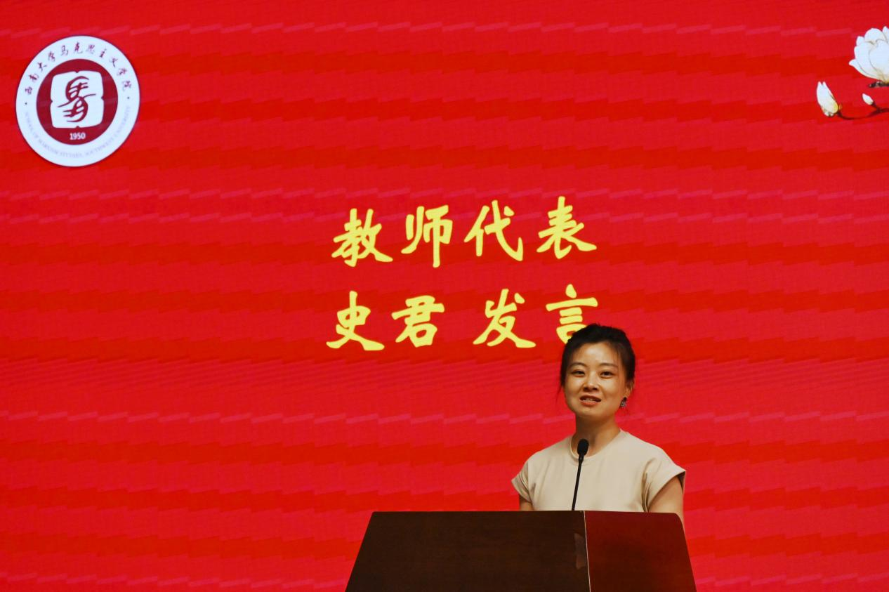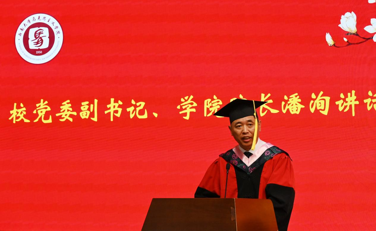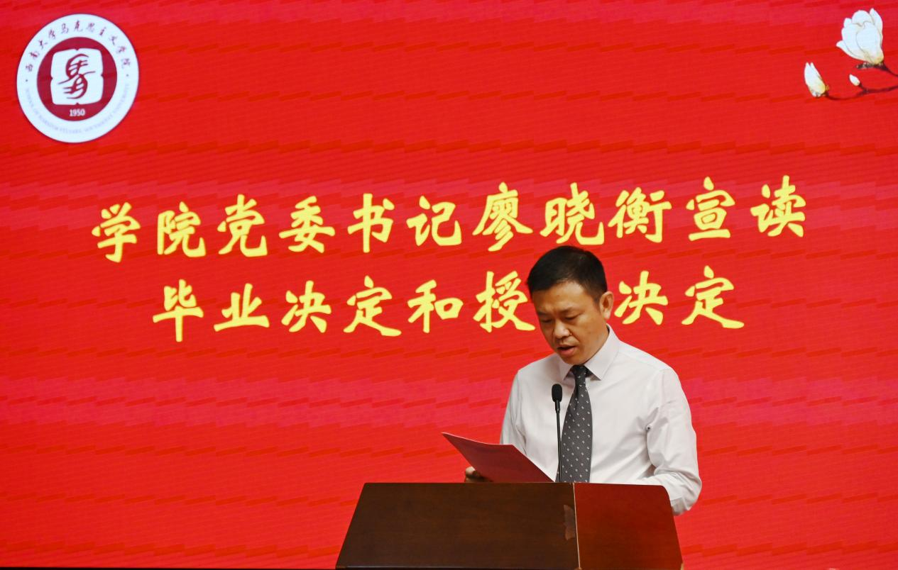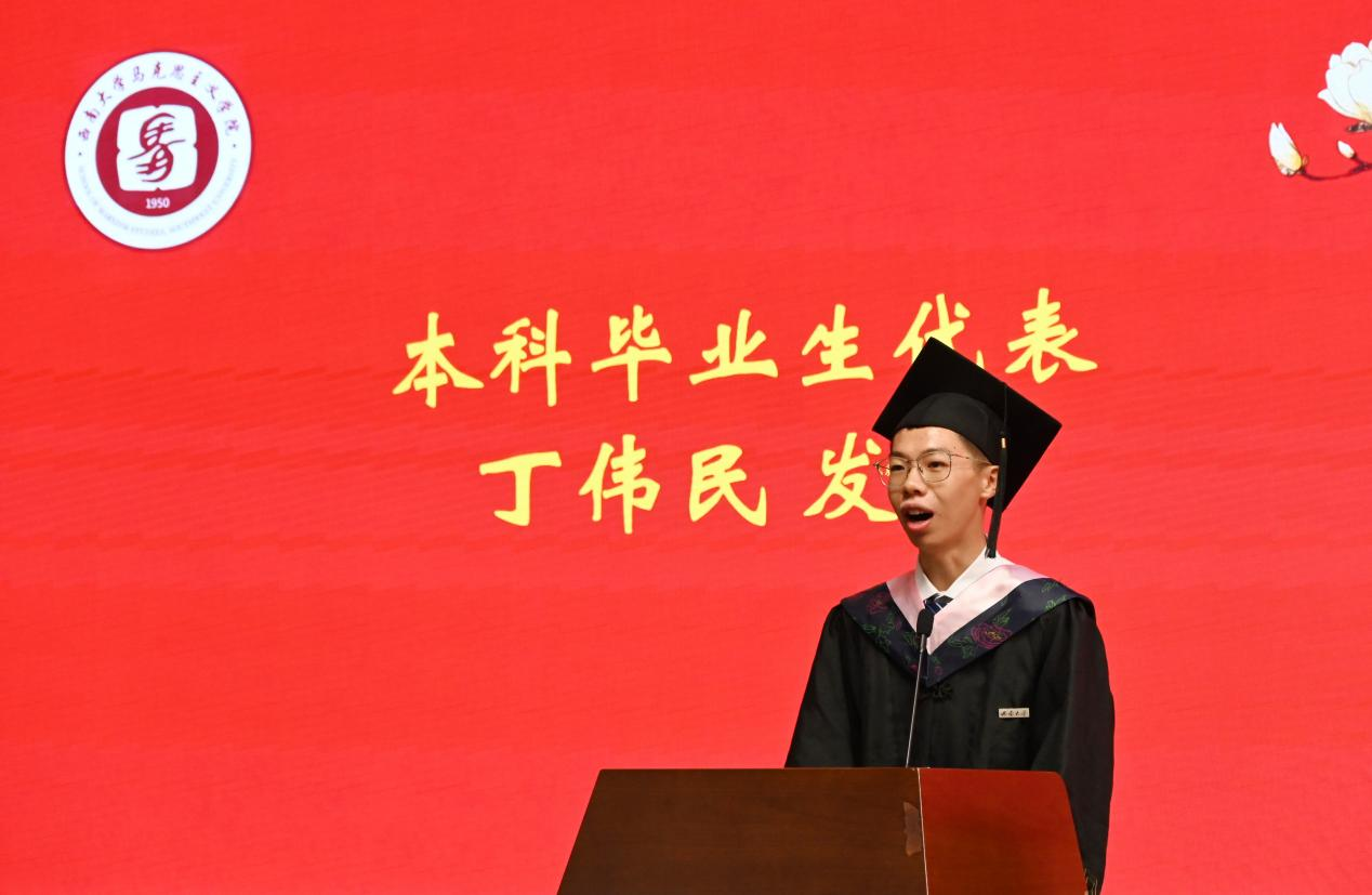 本科毕业生代表丁伟民分享了四年在公司老师的培养下逐渐自立自强的成长经历,回味了校园生活中的点滴岁月,表达了将自己的岗位上继续展现西大马院人的独有风采,为全面建设社会主义现代化国家贡献青春力量的决心!