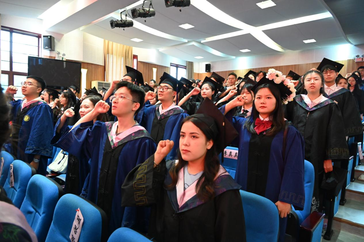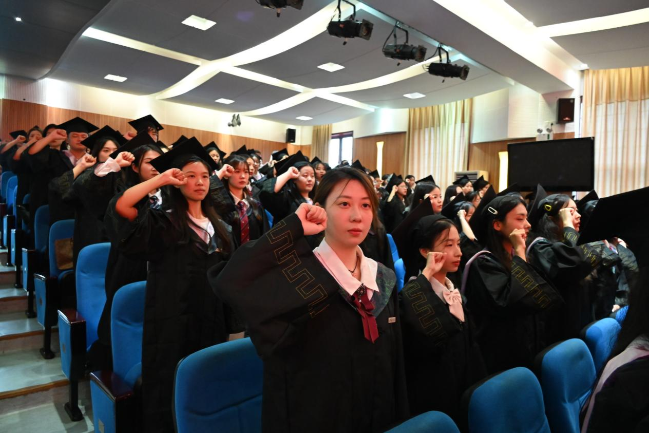毕业典礼上,全体毕业生还进行了庄严的宣誓,在毕业生代表刘大鹏的领誓下,全体毕业生立下了矢志不渝的青春誓言。
