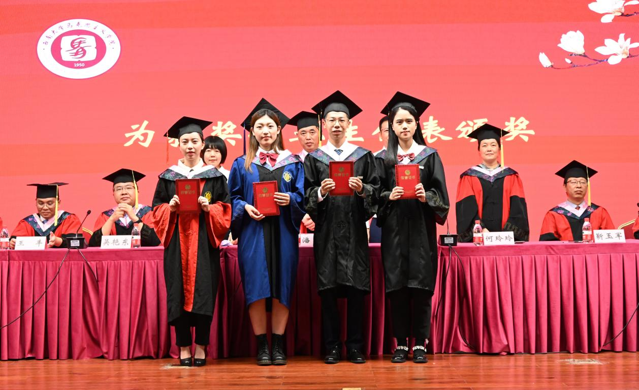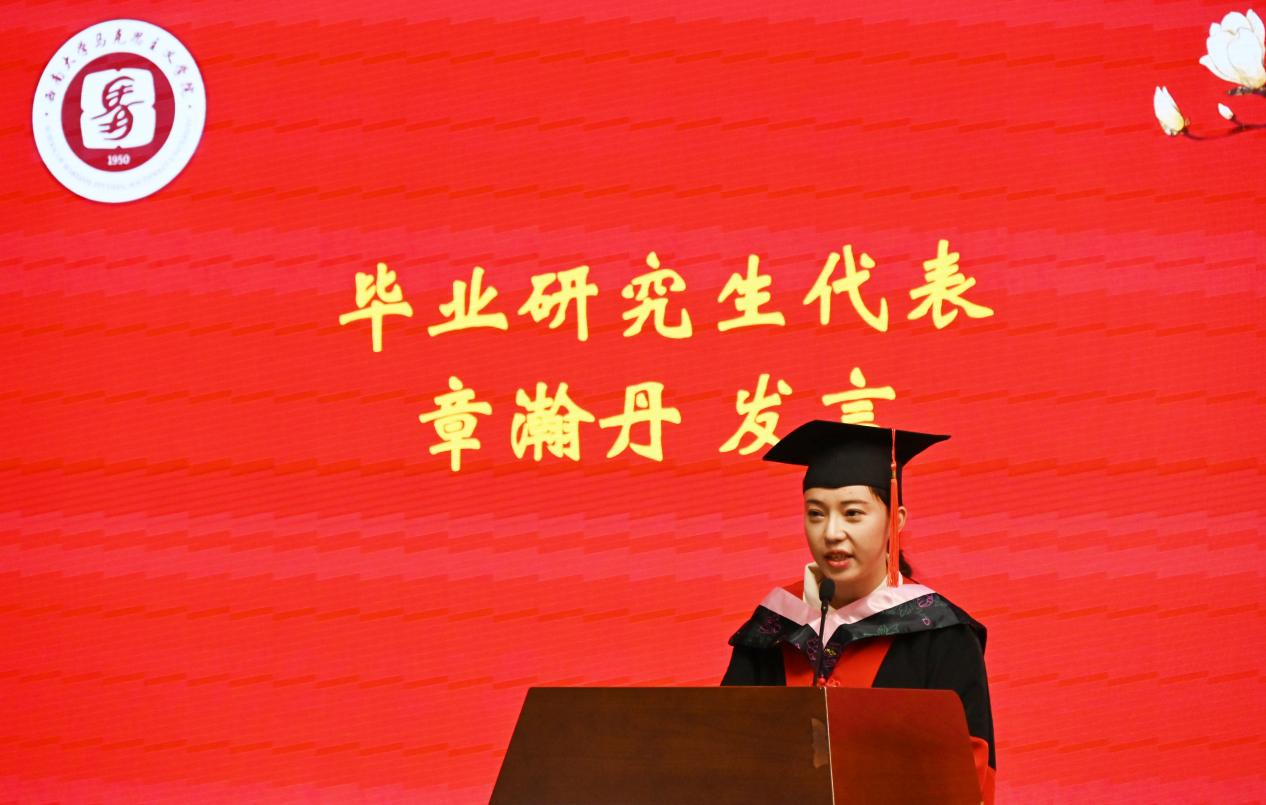 毕业研究生代表章瀚丹回顾了在西大马院挥洒青春,努力拼搏的日子,表示难忘这些年公司给予的关怀和老师们的谆谆教诲,将谨记“做人做事做学问、尽心尽力尽责任”的公司精神,践行“为真理而斗争”的公司院训,做深耕理论并投身实践、胸怀大志并脚踏实地、堪当大任并笃行致远的人。