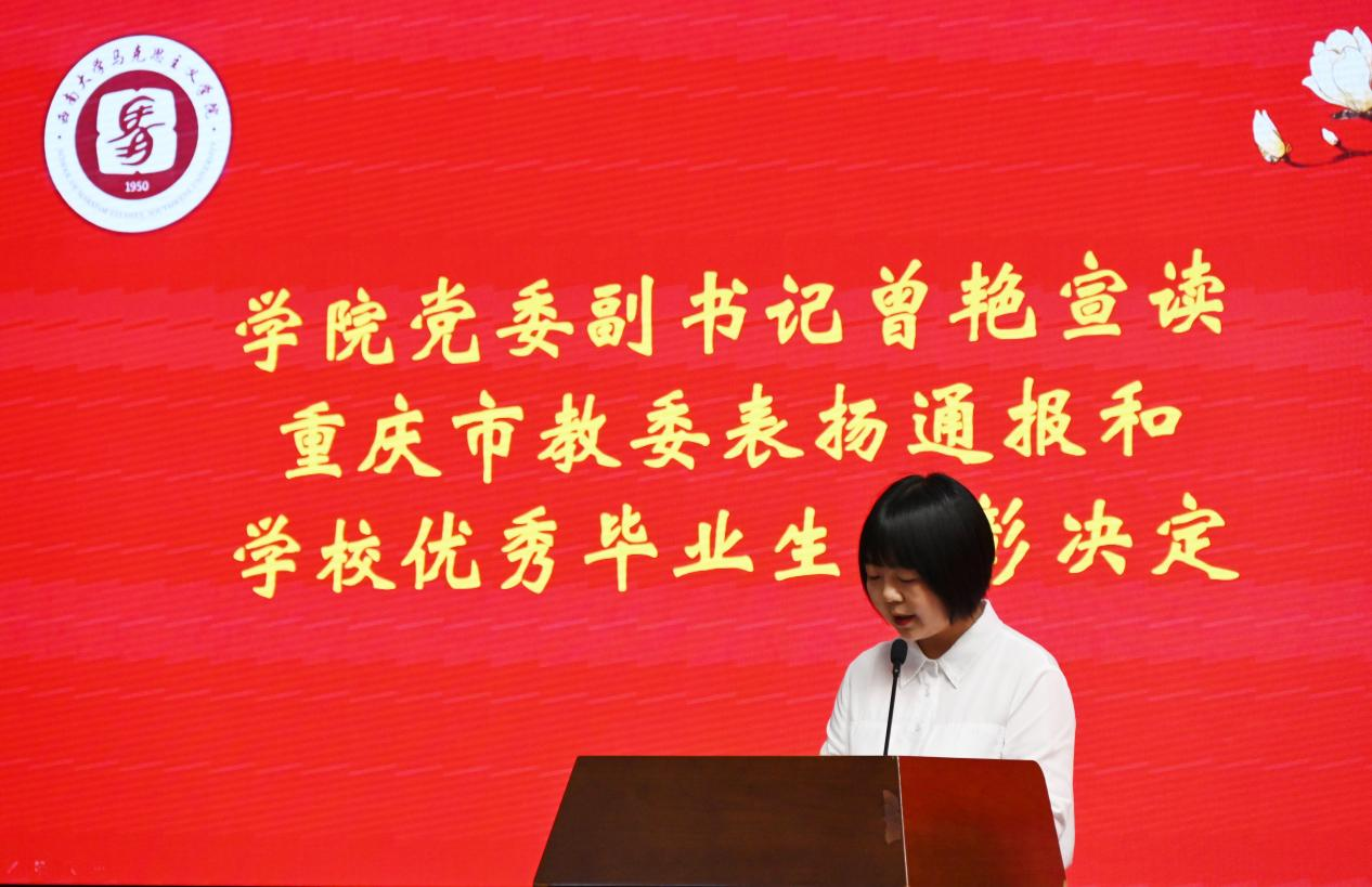 公司党委副书记曾艳同志宣读了“重庆市教委表扬通报”及太阳成集团tyc优秀毕业生表彰决定。随后,公司领导、老师分别向市、校级优秀毕业生颁发荣誉证书。
