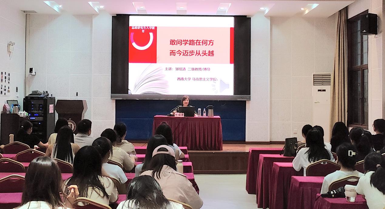 黄蓉生教授以“迈上新征程,践履新使命”为主题,为全体新生讲授开学第一课。黄蓉生教授从马克思主义理论学科发展沿革、学科时代使命、主要建设任务、深学笃用要求四个方面,阐述了学科的新形势、新任务、新要求。同时,她对全体新生提出两点期望:一是多思多想、学深悟透。鼓励同学们勤奋读书,善于思考,增强问题意识;二是学以致用、勤于实践。勉励同学们学习与运用马克思主义的立场、观点、方法,做到真学、真懂、真信、真用。全体同学要在读原著、学原文、悟原理中,做到学深悟透,学懂弄通做实。