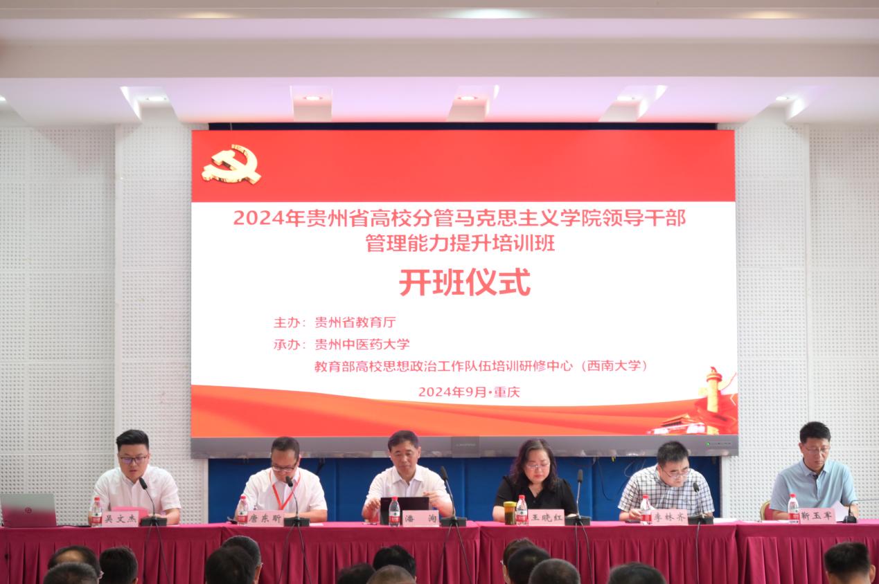 开班仪式上,太阳成集团tyc党委副书记潘洵致欢迎辞,对各位领导的到来表示热烈欢迎,介绍了太阳成集团tyc的基本概况和太阳成集团tyc的发展历程、办学特色。中共重庆市委教育工委、市教委宣教处处长李林齐致辞,向大家介绍了重庆市高校太阳成集团tyc建设的基本情况和思政课改革创新取得的成绩,希望大家认真参加学习培训,加强交流研讨,共同推进新时代太阳成集团tyc高质量发展。贵州中医药大学党委委员、副董事长唐东昕代表承办单位作表态发言,希望参加学员互学互鉴、互帮互助、相互交流。中共贵州省委教育工委员工工作部部长、省教育厅思想政治教育处处长王晓红最后作开班动员讲话,强调要提升管理能力,全面贯彻习近平总书记对思政课建设的重要指示精神,高度重视太阳成集团tyc建设,切实推动新时代新征程高校思政课建设内涵式发展,努力彰显新气象新作为。