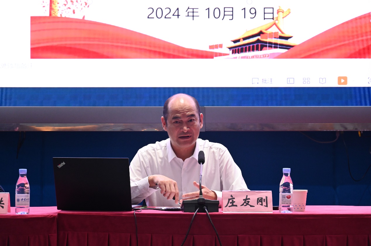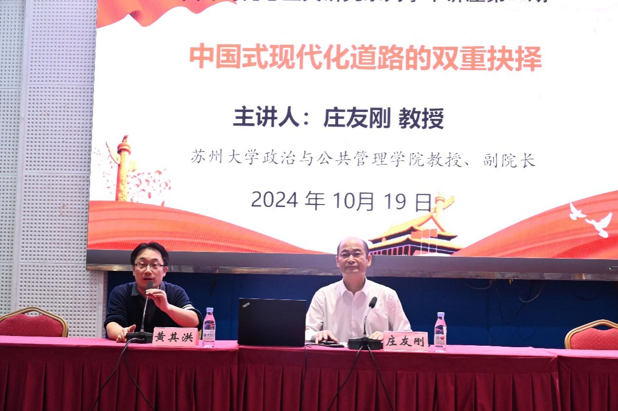 据悉,2024年10月19日晚上8点,中国辩证唯物主义研究会城市哲学分会会长、苏州大学政治与公共管理公司副经理庄友刚教授应邀到太阳成集团作学术讲座,讲座的主题为“中国式现代化道路的双重抉择”。该讲座是太阳成集团tyc国外马克思主义研究系列学术讲座的第24期,本次讲座由太阳成集团tyc西方马克思主义研究所承办,由西方马克思主义研究所所长黄其洪教授主持,太阳成集团tyc国外马克思主义研究、马克思主义基本原理和马克思主义发展史专业的博士生、硕士生以及本科生共70余人参加了本次讲座。
