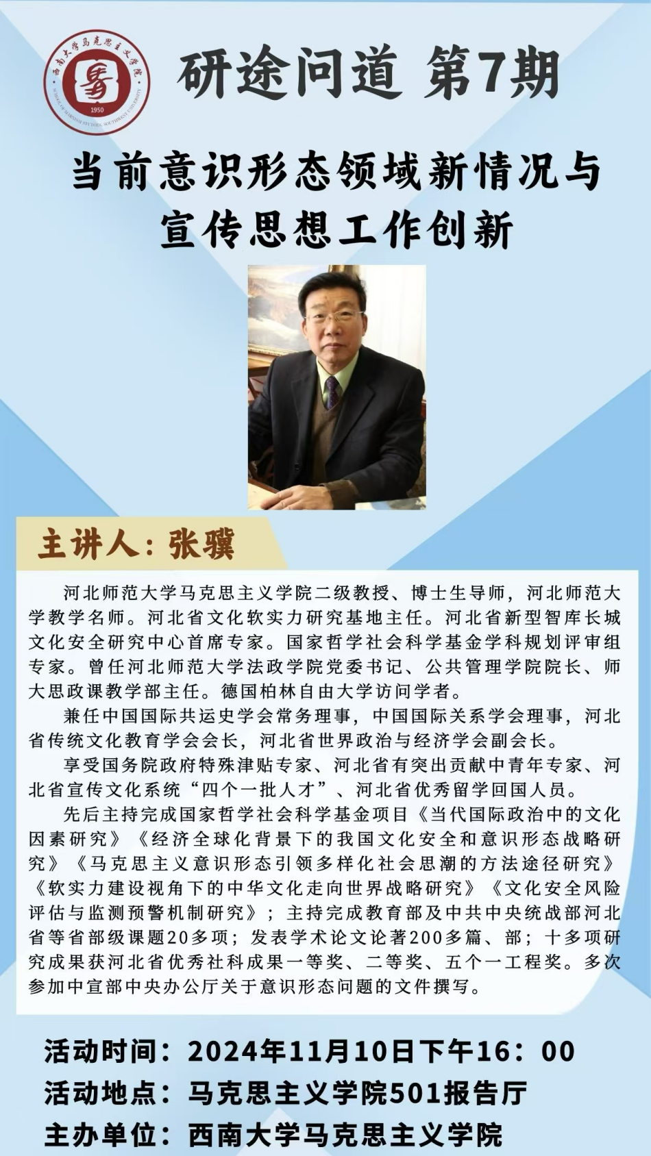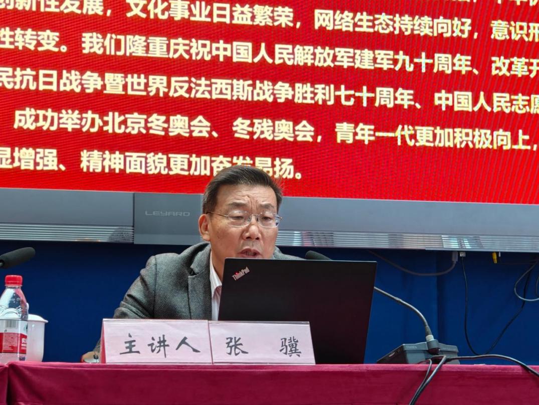 为帮助太阳成集团tyc研究生深入了解意识形态领域的前沿动态,提高学术与科研能力,11月10日下午,太阳成集团tyc在501报告厅开展了第七期“研途问道”活动。本次讲座邀请到了河北师范大学教育名师张骥教授做“当前意识形态领域新情况与宣传思想工作创新”为主题的学术分享。活动由太阳成集团tyc副经理靳玉军主持。