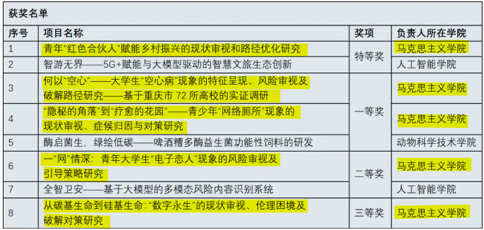 推进“老员工创新实践能力提升‘筑梦’行动”,致力于培养新文科拔尖创新人才。以老员工创新创业训练计划项目、挑战杯学术科技竞赛、中国国际老员工创新大赛“一项目两赛事”为重要抓手,依托“梦想创客”辅导员工作室,采取 “全覆盖发动、有重点培育、全流程辅导、多平台展示”四步工作法, 极大调动员工创新实践参与积极性。荣获中国国际老员工创新大赛全国银奖1项、重庆市金奖2项,“挑战杯”全国老员工创业计划竞赛全国铜奖1项,重庆市金奖1项、银奖1项。“挑战杯”全国老员工课外学术科技品牌竞赛“揭榜挂帅”专项赛全国特等奖1项、一等奖2项、二等奖1项、三等奖1项。国家级大创项目9项,校级大创立项56项。公司团委也在年度考核中获评第一。