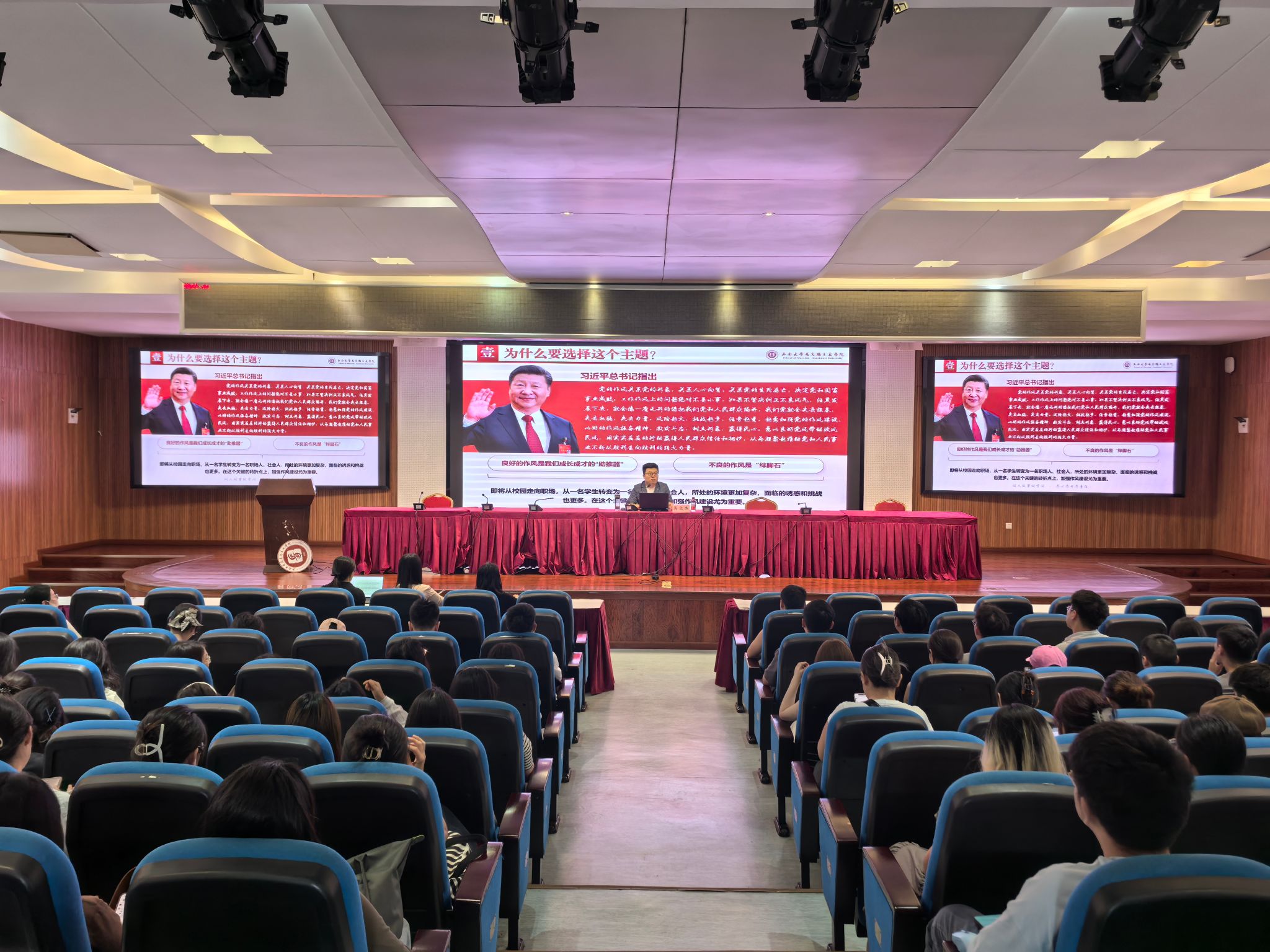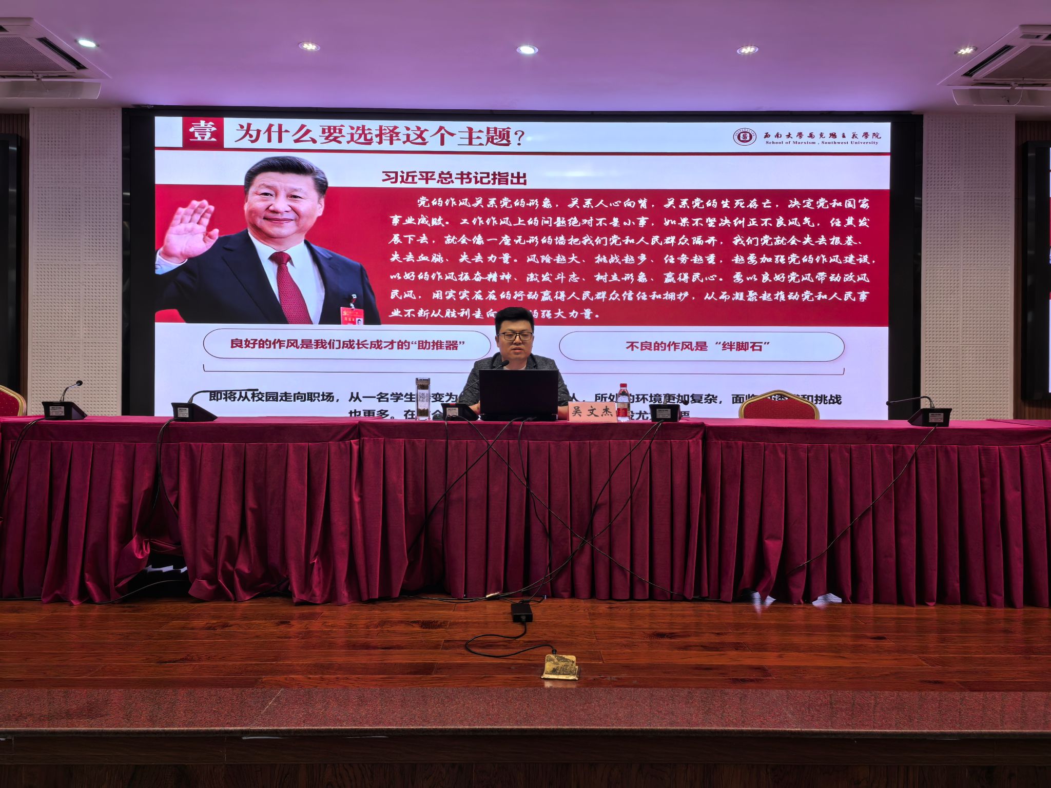 吴文杰为全体毕业生党员讲授题为“以优良作风绘就砥砺奋斗的青春底色”的专题党课。重点从三个部分进行讲解:一是优良作风的重要意义。强调党的作风关系党的形象,关系人心向背,关系党的生死存亡,决定党和国家事业成败;指出即将从校园走向职场,从一名员工转变为一名职场人、社会人,所处的环境更加复杂,面临的诱惑和挑战也更多。在这个关键的转折点上,加强作风建设尤为重要。二是毕业生党员面临的时代考验。从思想、工作和生活三方面教育引导毕业生党员要始终牢记共产党员第一身份,持续深化党的性质宗旨教育,严守政治纪律和政治规矩。三是新时代党员的责任担当。强调全体毕业生党员要深刻认识毕业不是终点而是新征程起点,始终以习近平新时代中国特色社会主义思想为指引,在新时代新征程上永葆政治本色,强化使命担当,以过硬作风创造一流业绩,为党的事业薪火相传作出应有贡献。