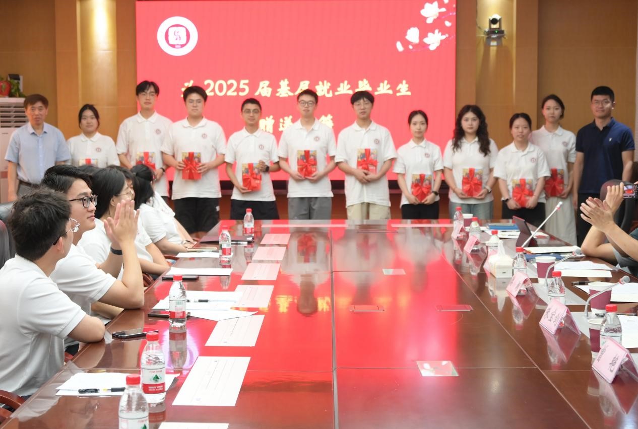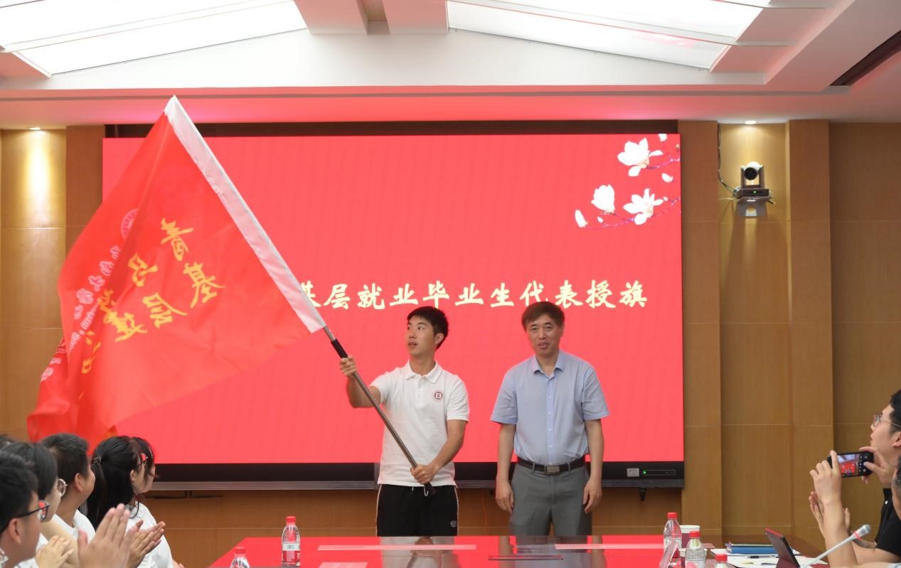 仪式上,公司经理潘洵向2025届基层就业毕业生授旗,并为基层就业毕业生赠送书籍——《习近平走进百姓家》。