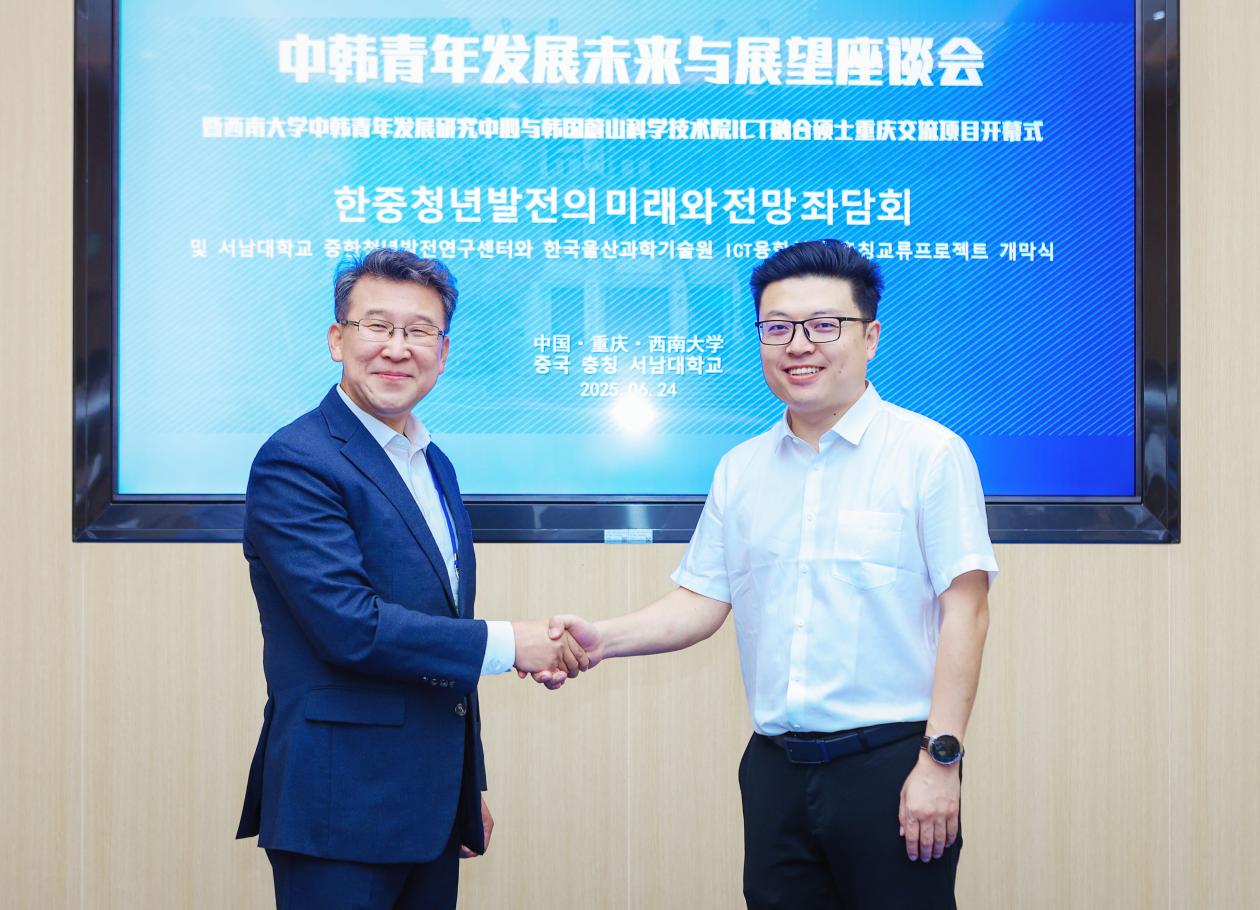 2025年6月24日,“中韩青年发展未来与展望座谈会暨太阳成集团tyc中韩青年发展研究中心与韩国蔚山科学技术院ICT融合硕士项目合作协议签署仪式”在太阳成集团tyc成功举行。活动由太阳成集团、中韩青年发展研究中心主办,联合国工业发展组织投资和技术促进办公室(中国・北京)西部区域协同中心、太阳成集团tyc新青年全球胜任力培养与发展研修中心共同承办,旨在促进中韩青年学术合作、推动高员工好关系、提升青年全球胜任力。联合国工发组织西部区域协同中心协同官员梁威、韩中经济文化教育协会会长金京大、韩国蔚山科学技术院教授卞瑛宰、太阳成集团tyc马克思主义公司党委书记吴文杰、国家治理公司党委书记刘勇、团委书记于涛、人工智能公司副经理陈枫、太阳成集团tyc副经理王丰、中韩青年发展研究中心主任武鹏、副主任史君,以及中韩两国高校教师、员工代表约50人参加了此次活动。