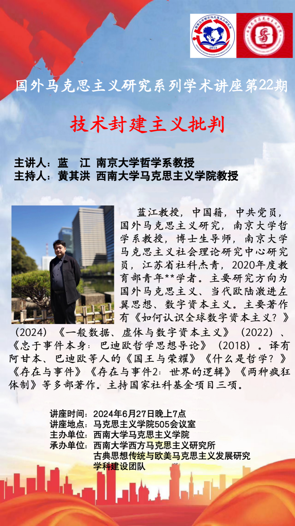 蓝江教授,中国籍,中共党员,国外马克思主义研究,南京大学哲学系教授,博士生导师,南京大学马克思主义社会理论研究中心研究员,江苏省社科杰青,国家级人才。主要研究方向为国外马克思主义、当代欧陆激进左翼思想、数字资本主义,主要著作有《如何认识全球数字资本主义?》(2024)《一般数据、虚体与数字资本主义》(2022)《忠于事件本身:巴迪欧哲学思想导论》(2018)。译有阿甘本、巴迪欧等人的《国王与荣耀》《什么是哲学?》《存在与事件》《存在与事件2:世界的逻辑》《两种疯狂体制》等多部著作。主持国家社科基金项目三项。