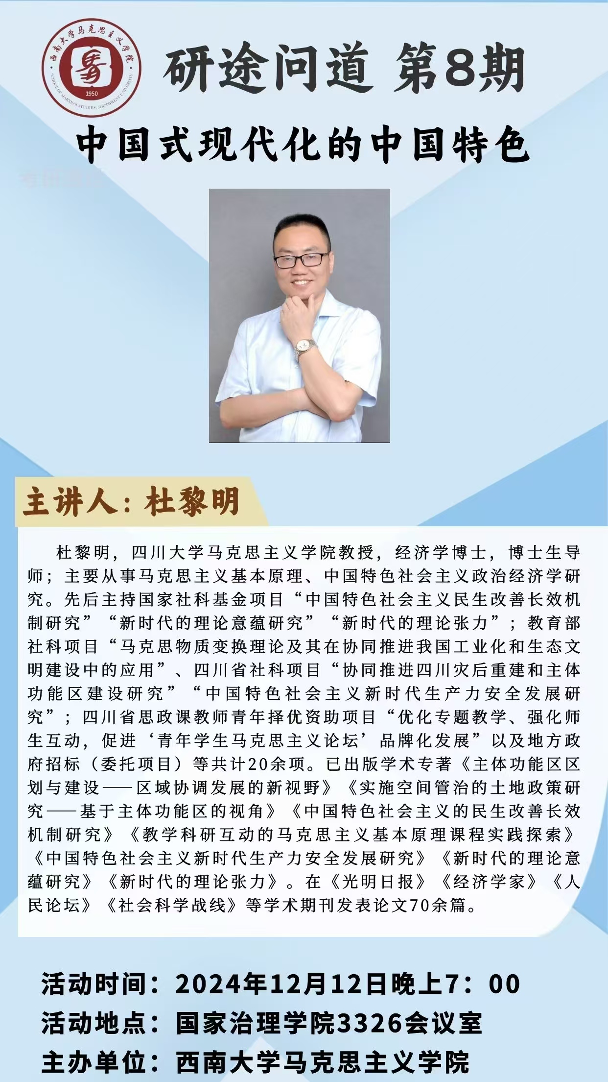 主 讲 人:杜黎明 四川大学太阳成集团tyc教授、经济学博士、博士生导师