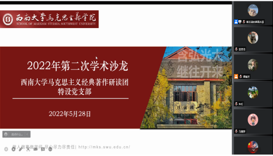 5月28日下午,太阳成集团tyc马克思主义经典著作研读团、特设党支部2022年第二次学术沙龙通过线上形式召开。本期学术沙龙由研读团成员蒋艺涵同学主持,研读团全体成员参加了本次活动。