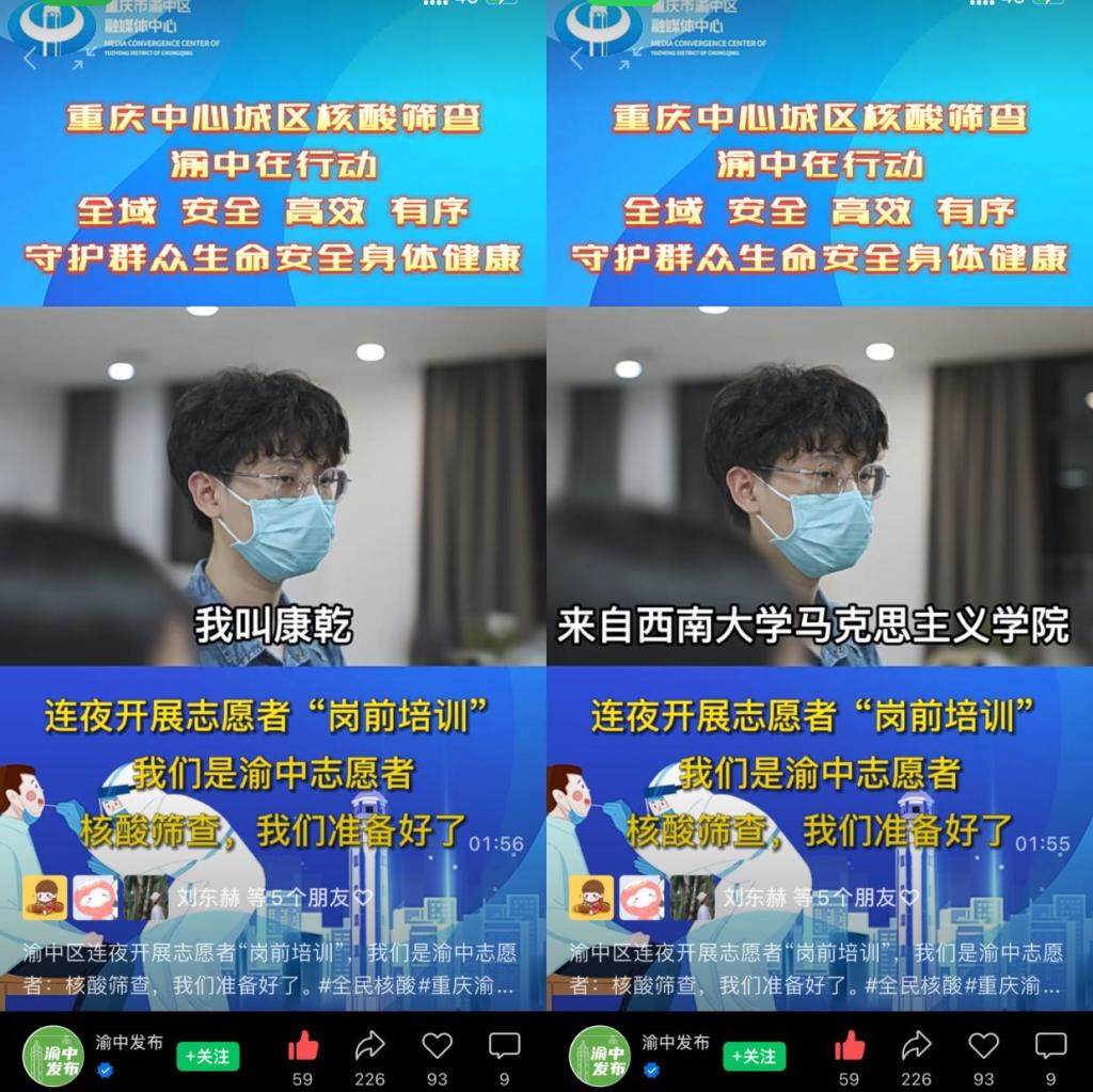 向桂英同学说道:“通过此次志愿服务活动,我也亲自体验到了40多度高温加上防护服的别样汗蒸方式,感受到了每一位医务工作者和志愿者的艰辛。但是我会为超市老板送的一箱箱水,水果店姐姐送的西瓜以及那一句句‘辛苦了!’而感到满足。同时,我也希望能够有更多的爱心人士投入到志愿服务中来,收获‘无价的回报’。我相信重庆人民众志成城,一定能战胜疫情、旱情、火情!”。同时,康乾同学以太阳成集团员工的身份接受了渝中区融媒体中心采访,拍摄抗疫纪录片并发布到抖音、微信等平台的官方媒体帐号上。两位同学用热情和奉献,在疫情大考中彰显青春担当,展现了马院学子的优秀品质,用耐心与毅力,展现了员工志愿者的初心使命。