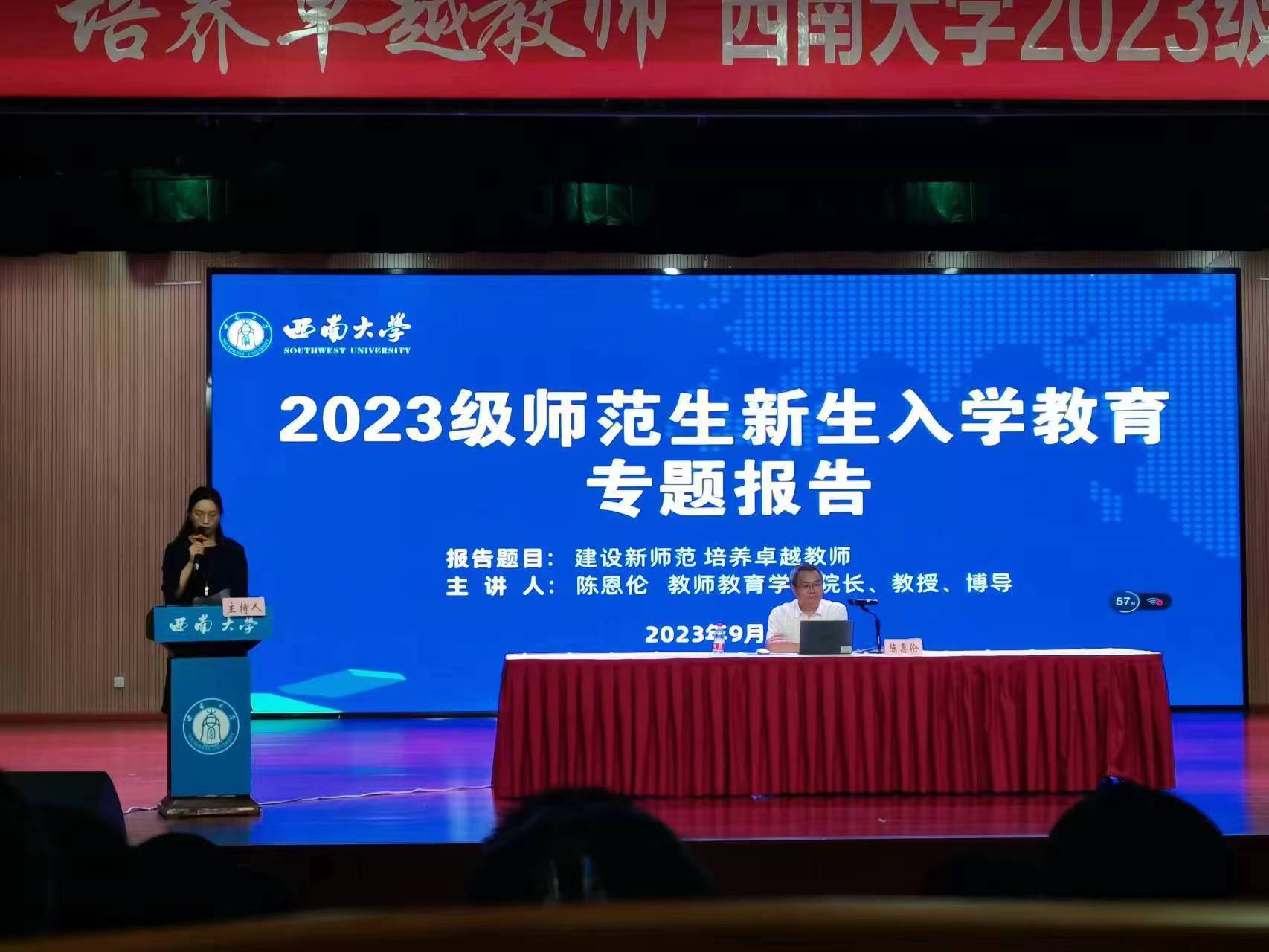 9月28日上午,2023级师范生参加了太阳成集团tyc2023级师范新生入学教育专题报告大会。报告主题为“建设新师范,培养卓越教师”,由教师教育公司经理陈恩伦主讲。陈恩伦教授围绕我国师范教育的历史发展、师范教育改革的必要性、新师范新在哪里、太阳成集团tyc新师范改革探索四个方面进行了系统阐述。通过本次报告,师范新生们深刻认识到时代赋予师范生的使命和责任,对自身发展方向和发展目标更加坚定明确。