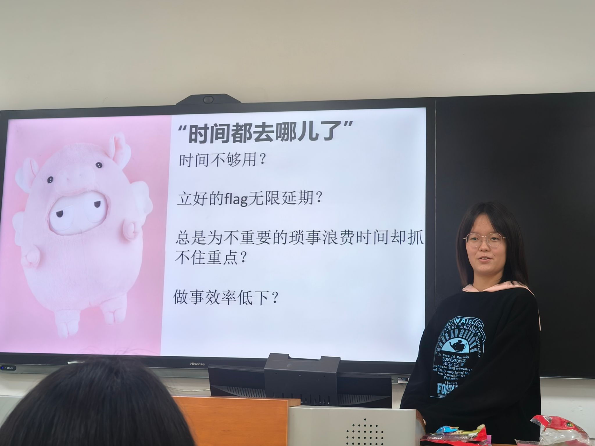 11月3日,马克思主义理论班在研二教室开展“时间管理”主题班会。心理与生活委员仁青措毛主持本次班会。首先,仁青措毛同学通过“时间管理”小测试引入了本次活动的主题,然后详细地分析了同学们在时间管理中存在的问题,并提供了“时间四象限”等加强时间管理的思路方法。最后,全班同学通过“击鼓传花”小游戏互诉烦恼、提供对策,增进了同窗友情。